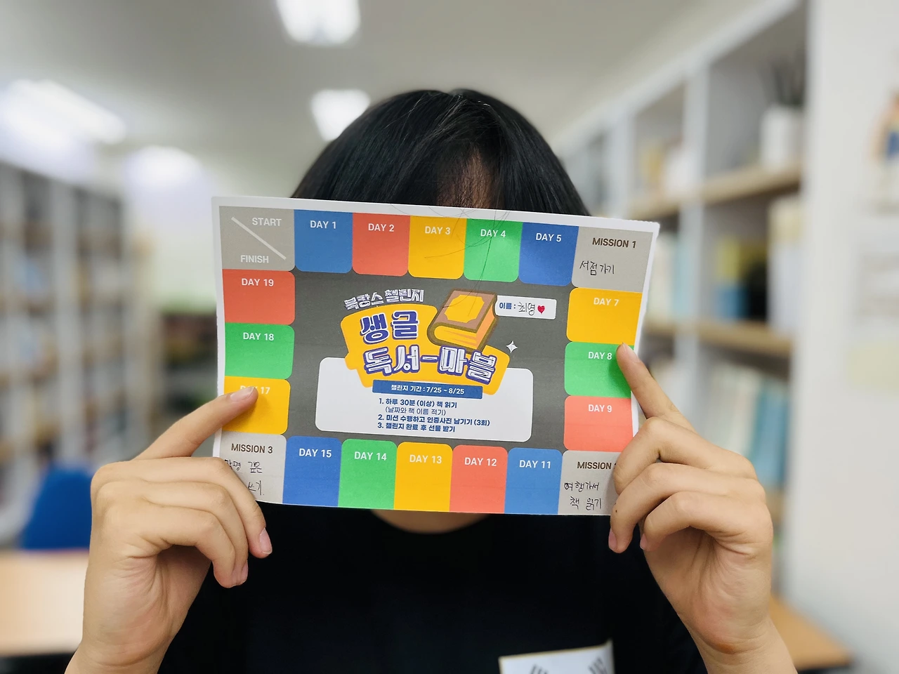 보드판 끝 3개의 모서리에는, 서점가기 / 휴가 때 책 가져가기 등 여러가지 예시를 주고, 스스로 특별한 미션을 골라 적극적으로 참여할 수 있도록 했다.