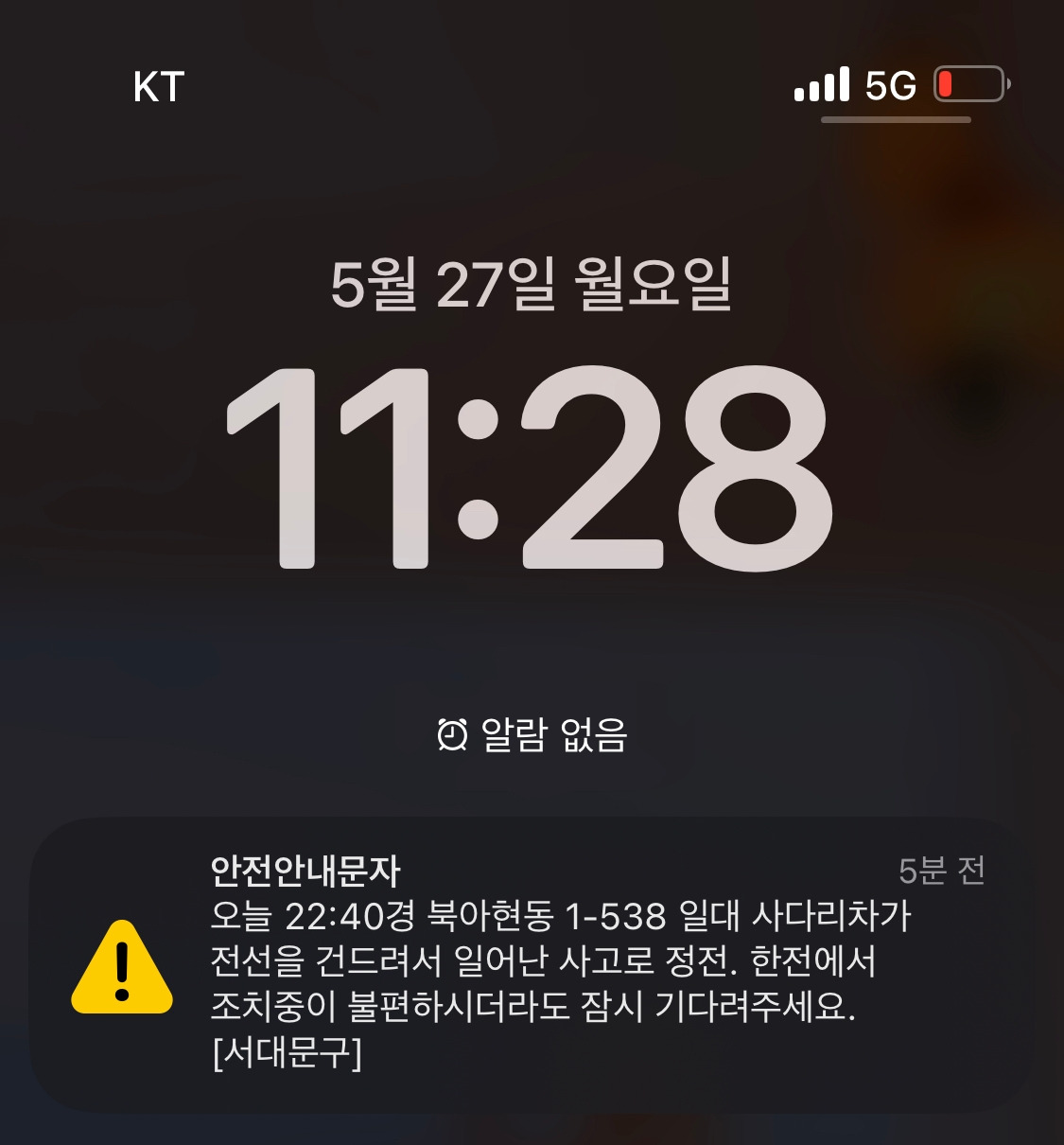 어젯 밤, 우리 아파트 전체가 정전이 됐었어. 밤 10시 40분쯤 불이 나가서 금방 들어올 줄 알았는데 아닌거야. 뉴스에서만 보던일이 현실이 되다니 하면서 핸드폰 배터리가 별로 없어서 걱정하며 5분 정도 지났을까.
