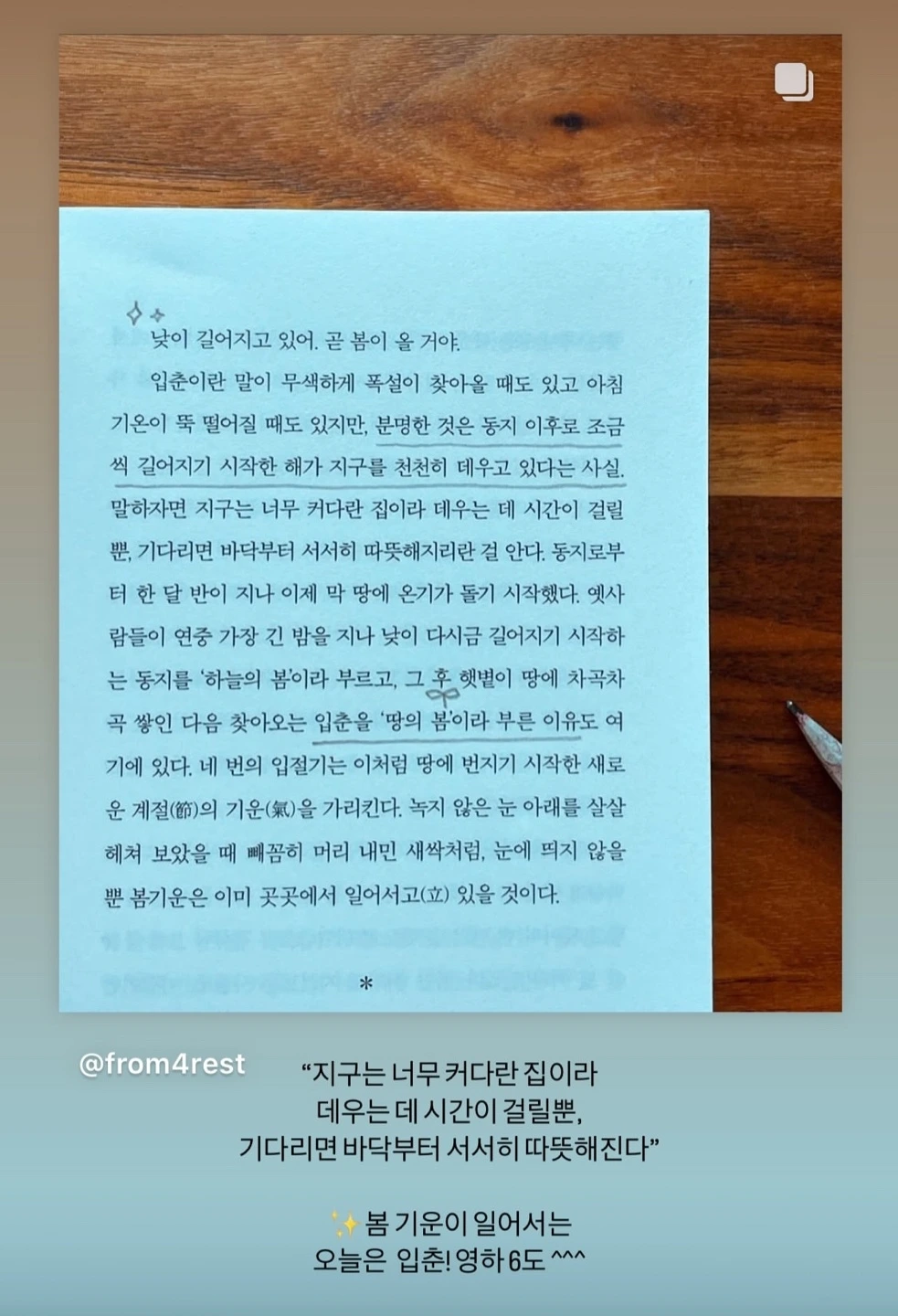 어제는 긴 연휴를 마치고 일상에 적응하는 첫 날이라 몸도 찌뿌둥하고 다시 추워진 날씨가 좀 원망스러웠는데 어제가 입춘이었더라구! 퇴근길에 <제철행복> 작가님의 인스타를 보면서 “입춘이라 그랬구나” 이해하게 됐어 ㅎㅎ