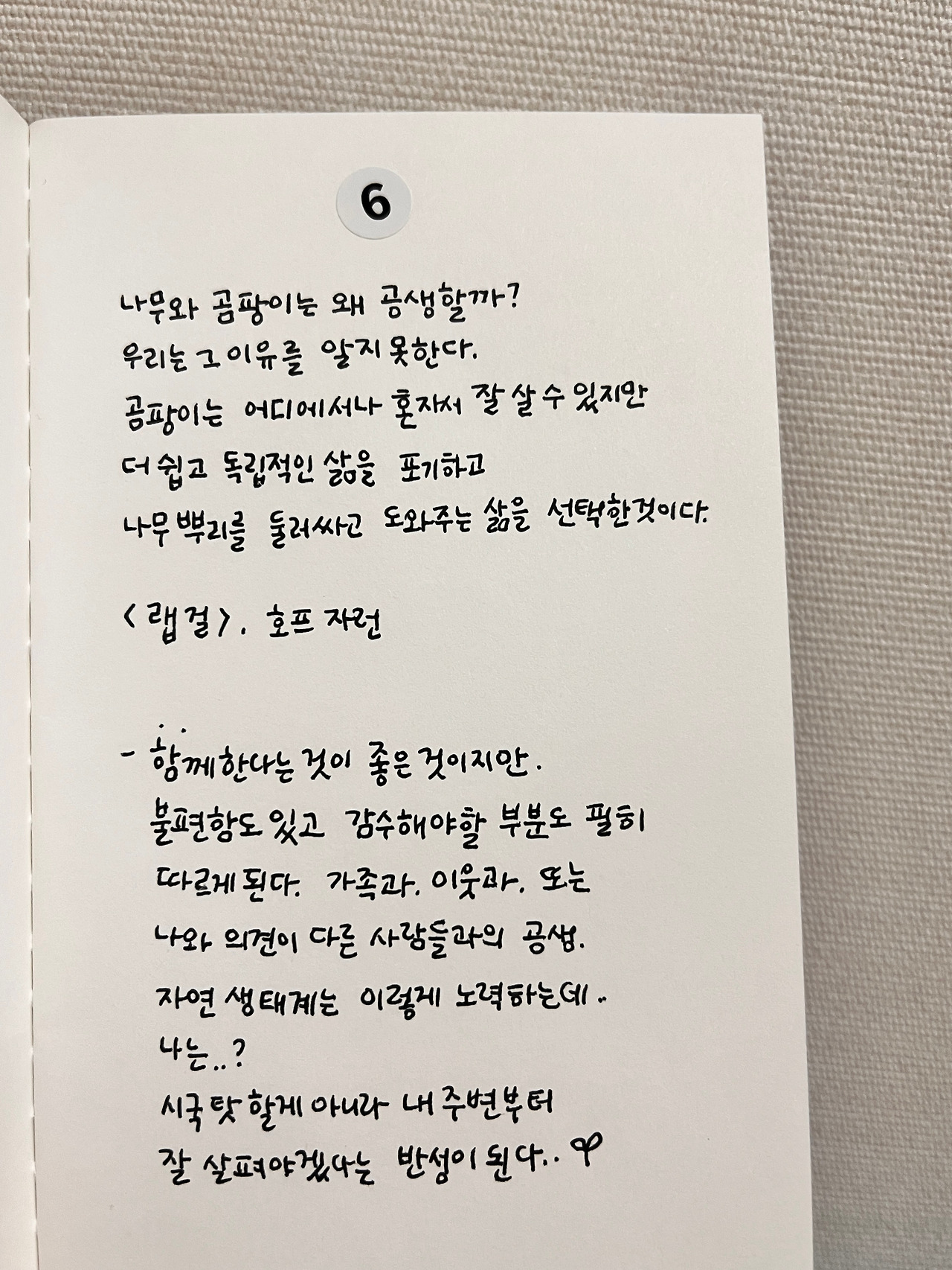 오늘은 이 책에서 나무와 곰팡이가 적이지만, 자연이라는 생태계 안에서 ‘홀로 살아남지 않고’ 공생하는 방향으로 존재하기로 선택했다는 내용이 와닿았어.