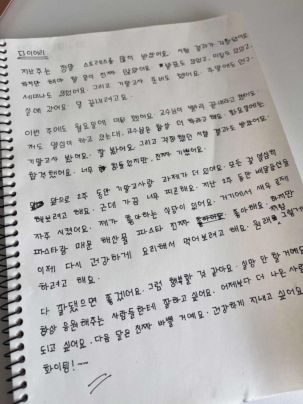 매주 화요일마다 외국인 유학생 친구들을 만나서 한국어수업을 하고 있어. 지난주에 일기 쓰기 숙제를 내줬는데 이렇게나 귀엽고 정성스레 써왔네 :)