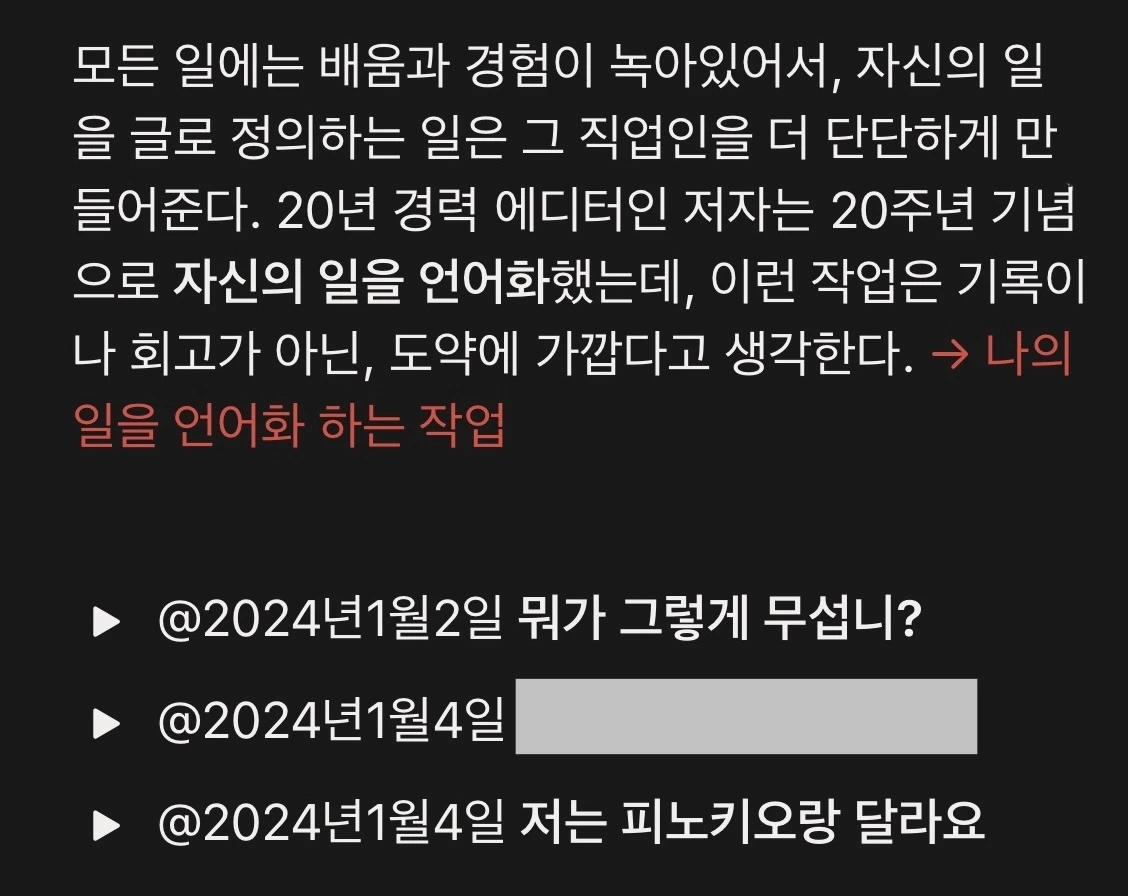 10월 20일은, 지금 하고 있는 일을 시작한지 5년째 되는 날이었어. 그래서 어제 동료와 함께 5년을 회고하는 시간을 가졌어. 그동안 적어두었던 기록,노트들도 다 꺼내보며 크게 5년을, 지난 1년을 회고해보았어. 신기한건 같은 사건을 다르게 인식하고 있기도 했고, 또 까먹기도 했던 순간들이 있었다는 점이야.