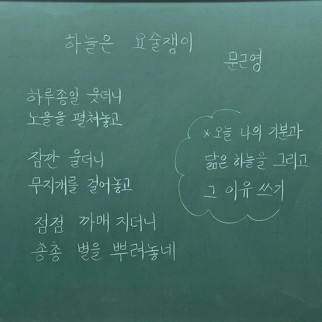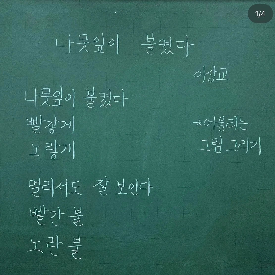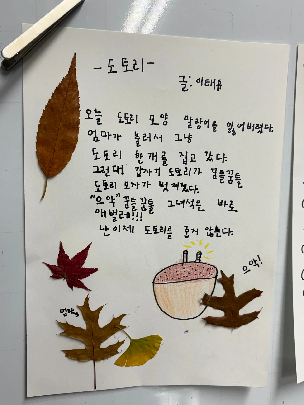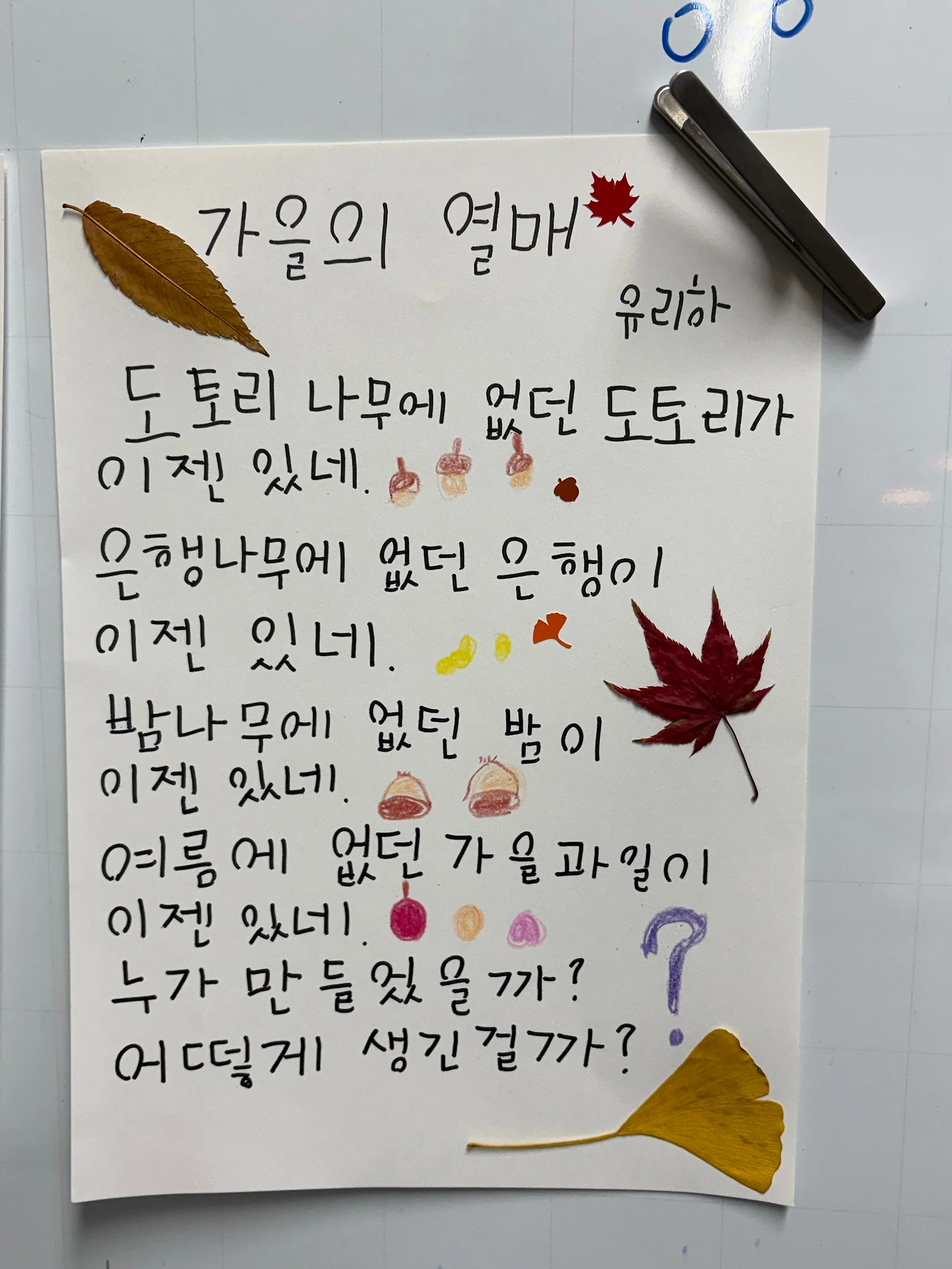 가을 낙엽을 열심히 주워서 잘 말려두었다가 어제, 아이들이랑 동시짓기를 했어. 먼저 감상해볼 수 있는 가을의 시들을 보여주고 감상평을 나눈 다음에 시를 지어보았어 ㅎㅎ 관찰하고 또 표현한 아이들의 작품에 감탄만 나오네 :)