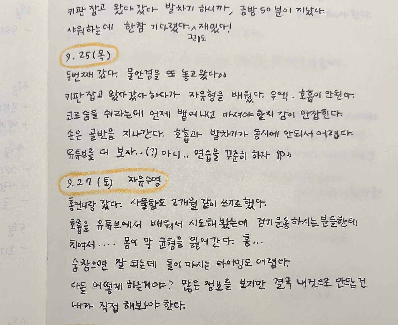 원정수영 와서도 강습선생님마다 영법이 달라서 혼란스러웠는데 이제 적응이 되어서 그간의 일기를 돌아보니, 성장과정(?)이 한눈에 보이더라고. 나만의 호흡방법을 찾지 못해 유튜브를 뒤적이며 더 아리송해졌던 시간들.. 이론적으론 알겠는데 몸이 따라와주지 않아서 물을 잔뜩 먹으면서도 시도해본 순간들이 고스란히 적혀있더라.
