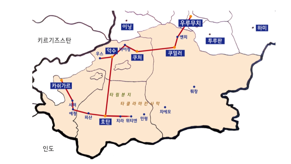 우루무치 - 옌치* - 쿠얼러 - 쿠처* - 바이청 - 악수* - 호탄* - 치라 - 위티엔 - 호탄 - 피샨 - 예청 - 사처 - 카쉬가르* - 우루무치