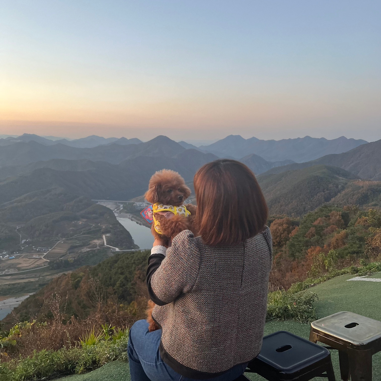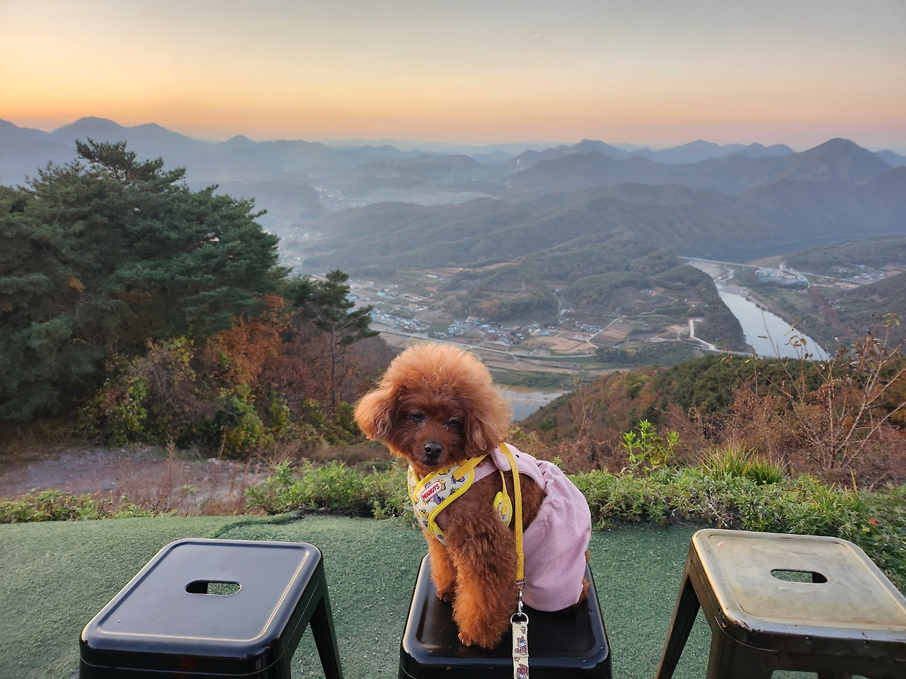 >>충청북도 단양군에는 산 위에 카페가 있어요. '카페산'이란 곳이고요, 패러글라이딩 체험도 가능한 곳입니다. 올라가는 길이 불국사 가는 길과 비슷해서 몹시 구불구불합니다. 운전 잘하는 동생이 태워줬습니다. 차를 오래 탄 정삐삐는 피곤해 보이네요. 내부는 반려견 동반이 되지 않고 야외테라스만 가능하지만 사실 이런 곳은 풍경이 더 중요하니까요. 저희는 석양질 무렵을 선호해서 맞춰 갔는데 금방 어두워져서 사진이 잘 안 찍히더라고요. 사진 찍으시려면 좀 더 일찍 가시는 게 좋을 것 같아요.