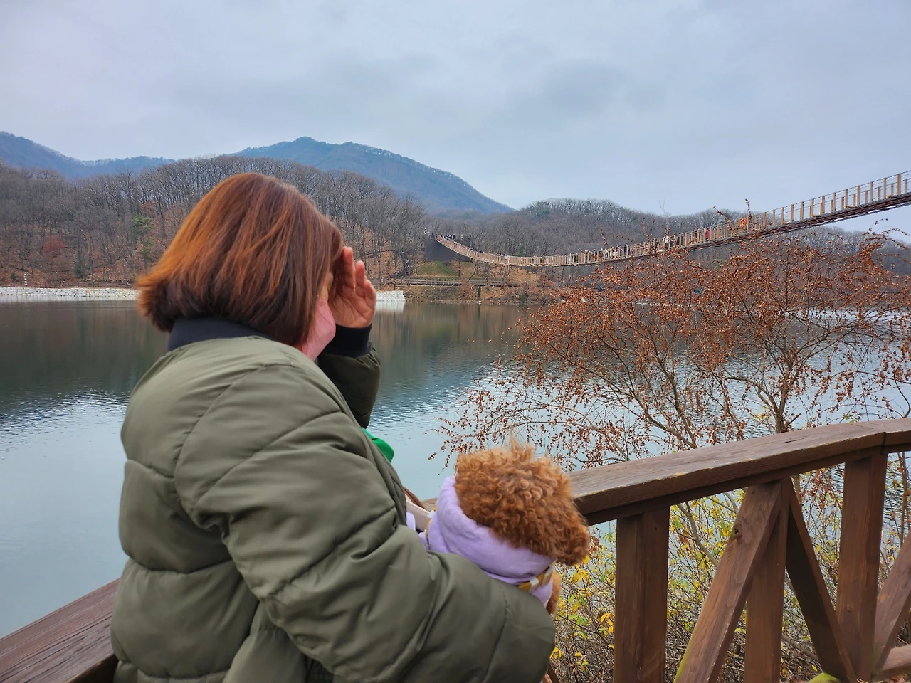 >>마장호수의 묘미는 뭐니 뭐니 해도 출렁다리인데요. 저는 보기만 해도 멀미가 나서 근처에도 안 갔습니다. 제가 만약 저 위에 올랐다면 분명히 소리소리 지르면서 삐삐 안고 눈감고 뛰었을 거예요. 모두의 평화를 위해 참았습니다. 하하.