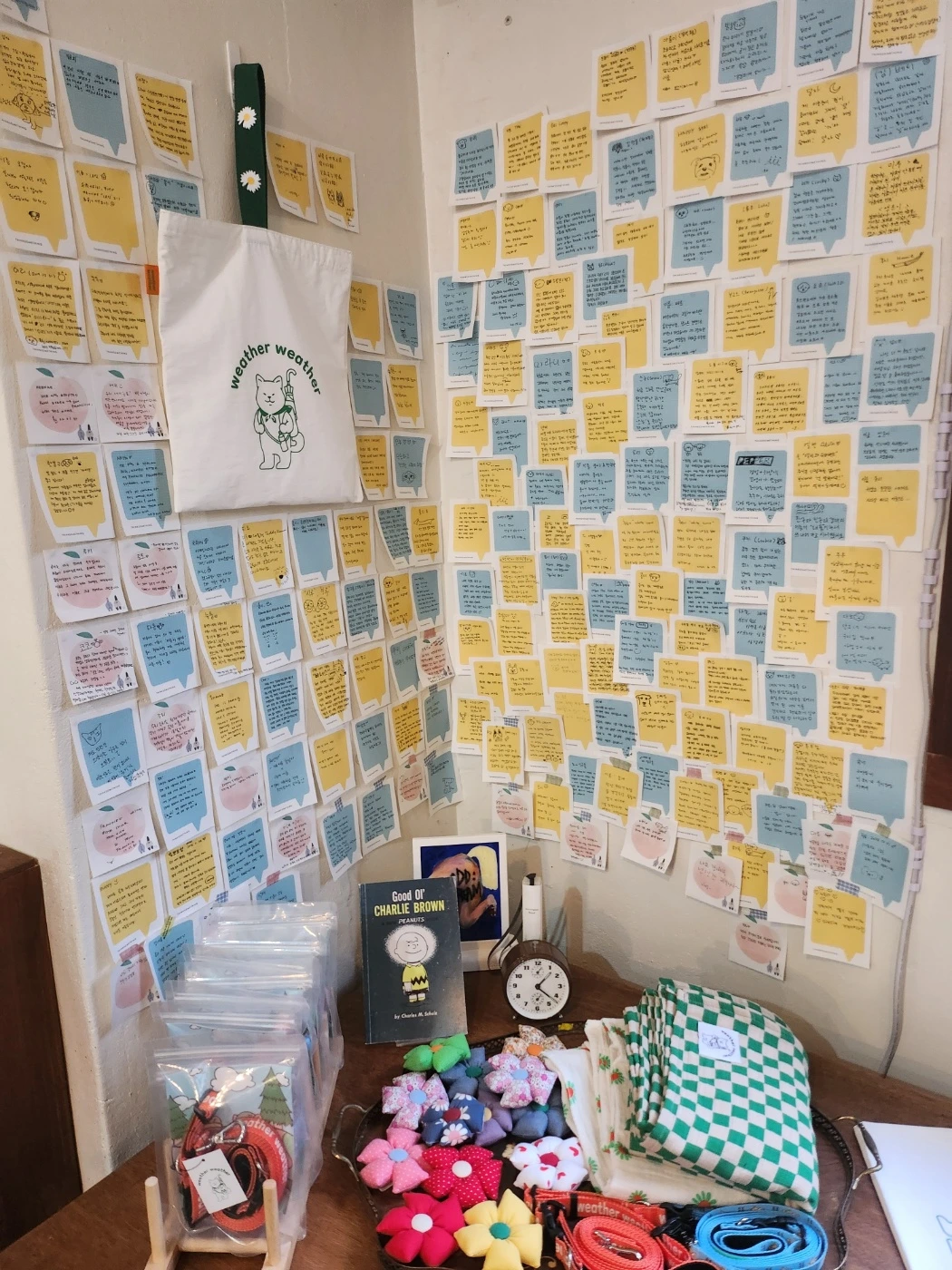 몇 시간 동안 책방을 전세 낼 수 있는 책방스테이도 예약제로 운영 중이고요. 무엇보다 눈길을 끄는 건 한쪽 벽면에 손님들이 자신의 반려견 이름에 담긴 이야기를 적은 포스트잇이 가득 붙어 있던 거였어요. 삐삐이야기도 써서 붙였는데 다른 사람들 글을 읽다 보니 뭉클해져서 삐삐한테 더 잘해야겠다 싶더라고요.