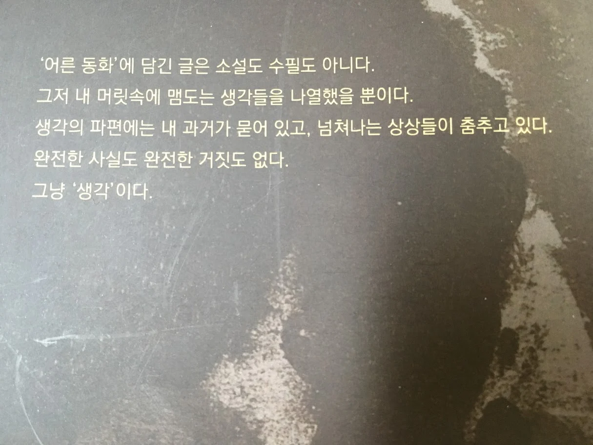 "'어른 동화'에 담긴 글은 소설도 수필도 아니다. 그저 내 머릿속에 맴도는 생각들을 나열했을 뿐이다. 생각의 파편에는 내 과거가 묻어 있고, 넘쳐나는 상상들이 춤추고 있다. 완전한 사실도 완전한 거짓도 없다. 그냥 '생각'이다."