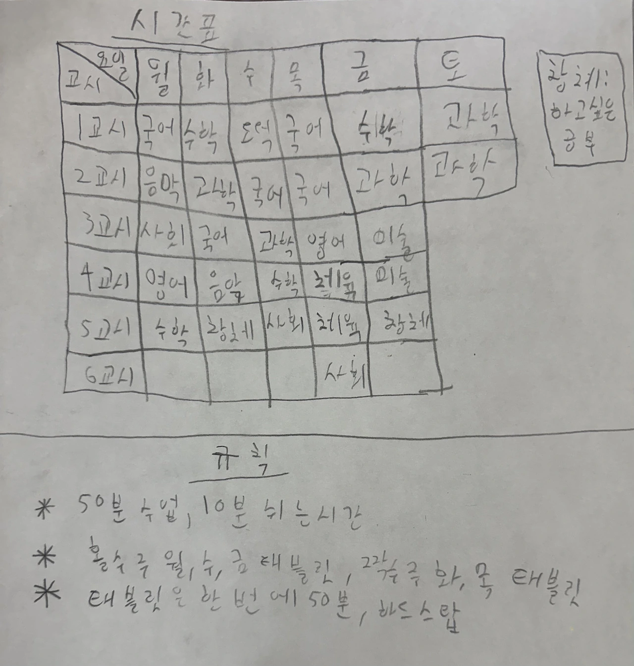어느 날 퇴근해 집에 돌아오니, 아이는 ‘미국 생활 시간표’를 만들고 있었다. 50분 공부, 10분 휴식. 야무진 규칙까지 세우며 이미 그곳에서의 하루를 살고 있었다.