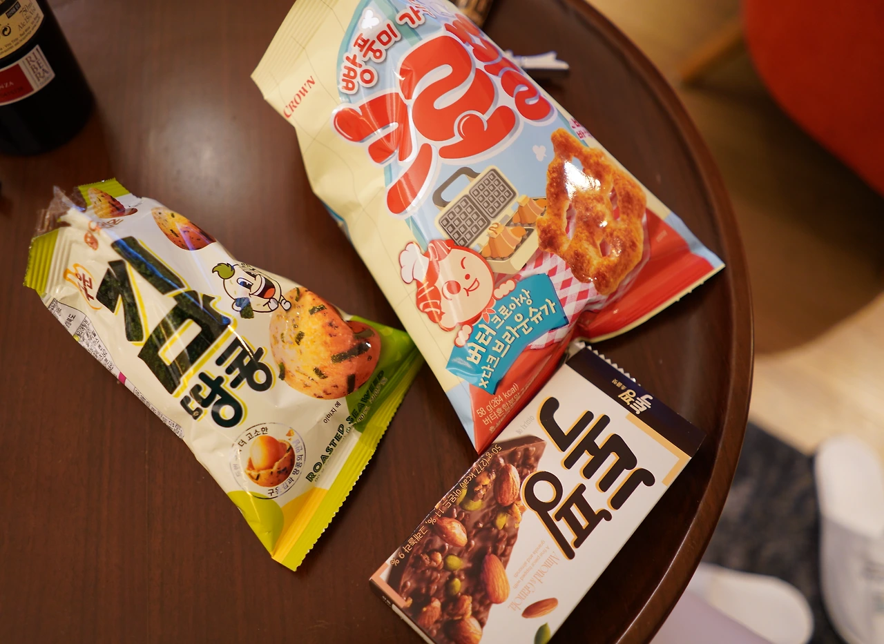 호텔에서 간단한 편의점 과자와 마셨는데, 크로플 과자와도 좋았지만, 견과류가 콕콕 박힌 초콜릿과 궁합이 좋았음!