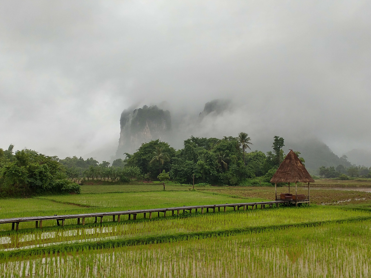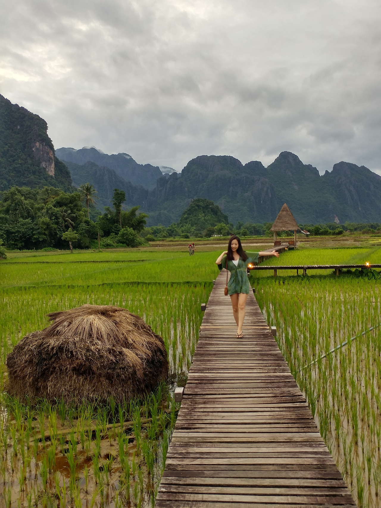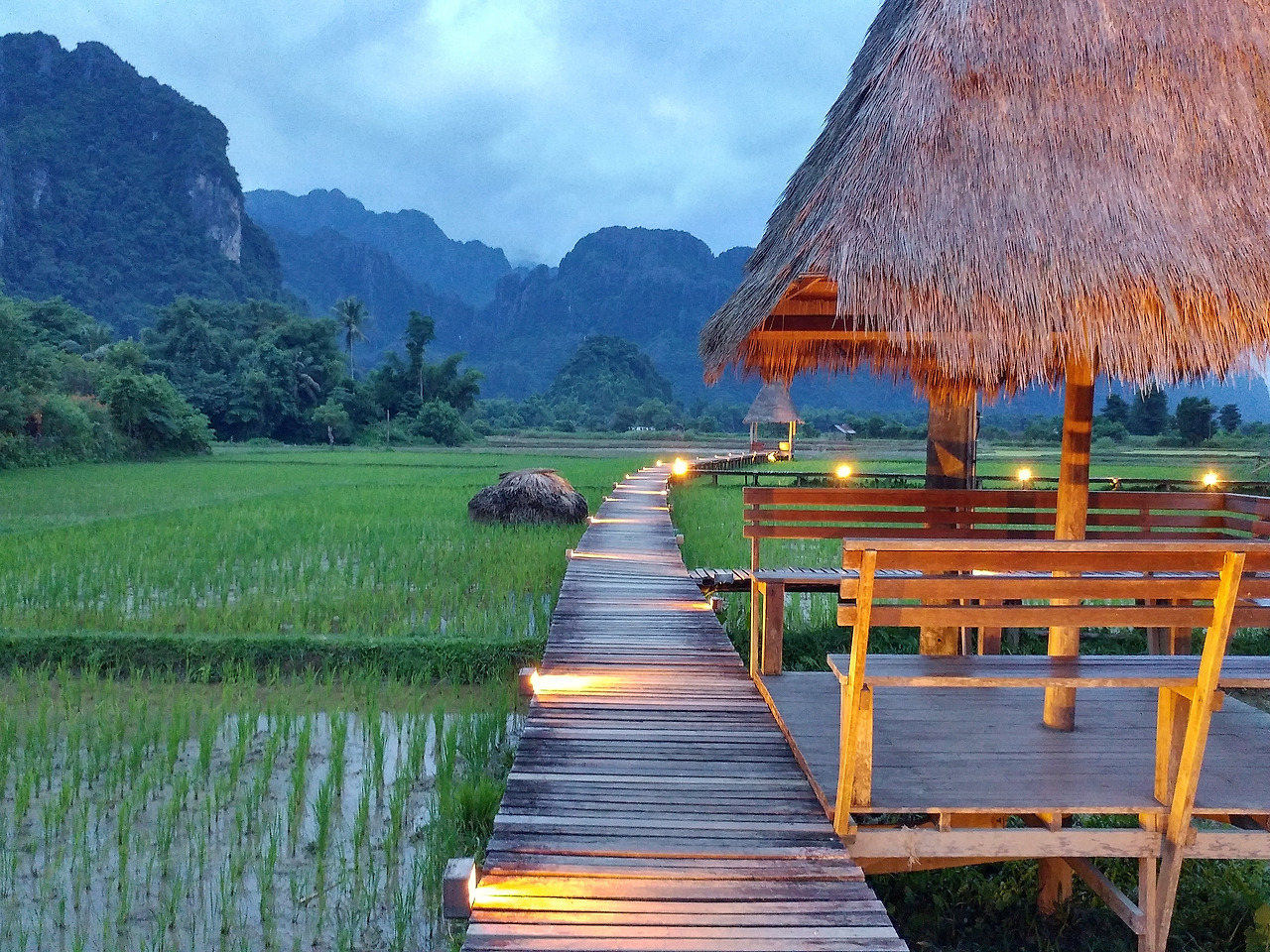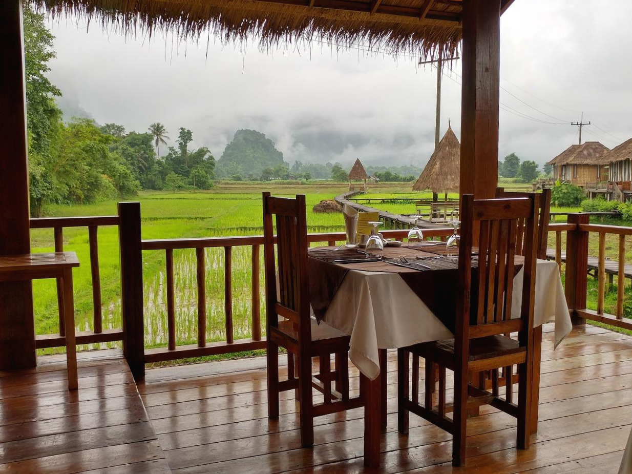 앞서 적은 글에서 잠시 언급되었던 그곳. 밤마다 수많은 호텔과 에어비앤비를 검색하다 누군가가 올려놓은 사진 한 장으로 방비엥의 숙소를 결정했다. 몰디브가 떠올랐다. 에메랄드 빛 물이 연둣빛 논으로 바뀐 것 같았다.