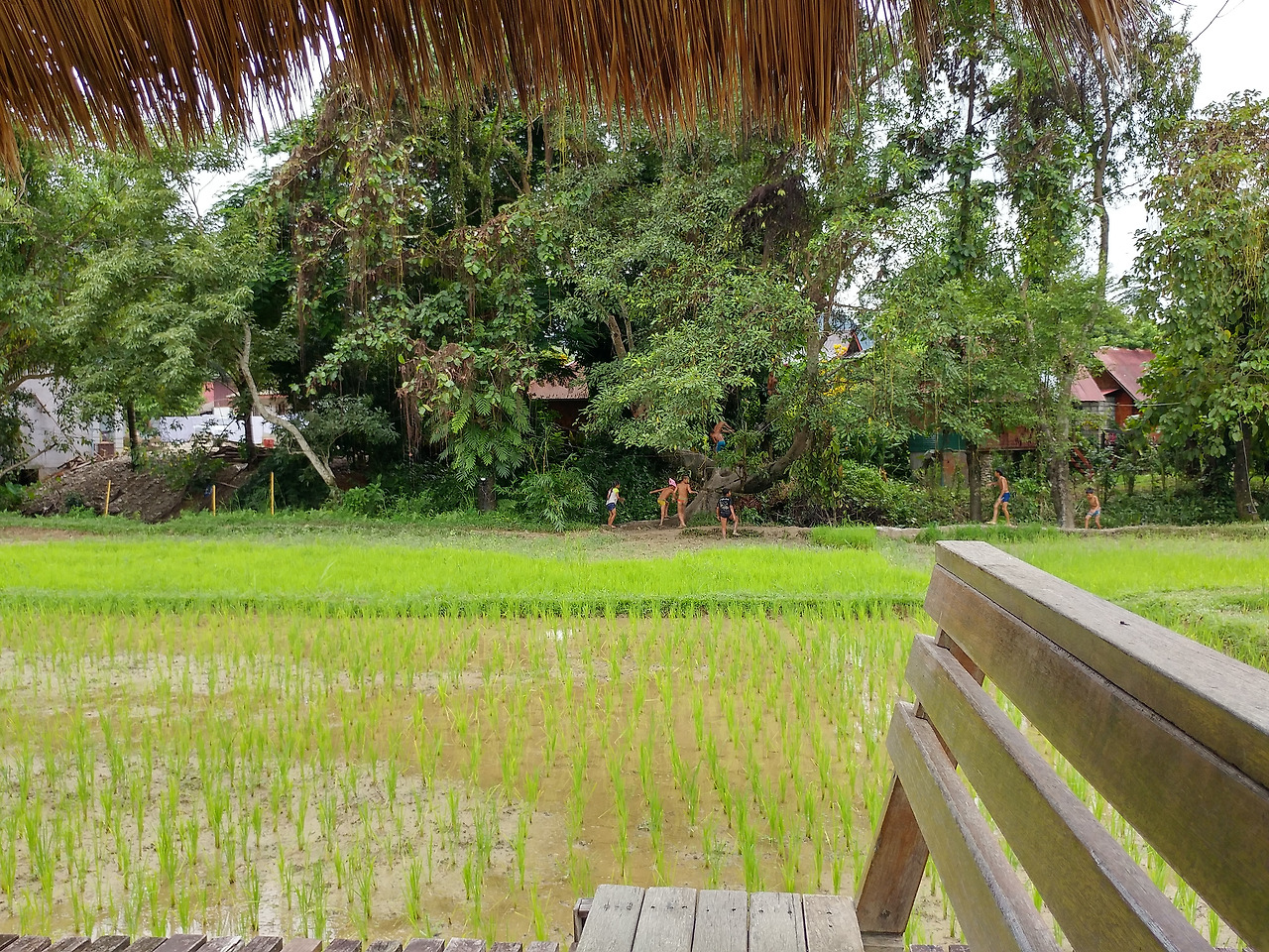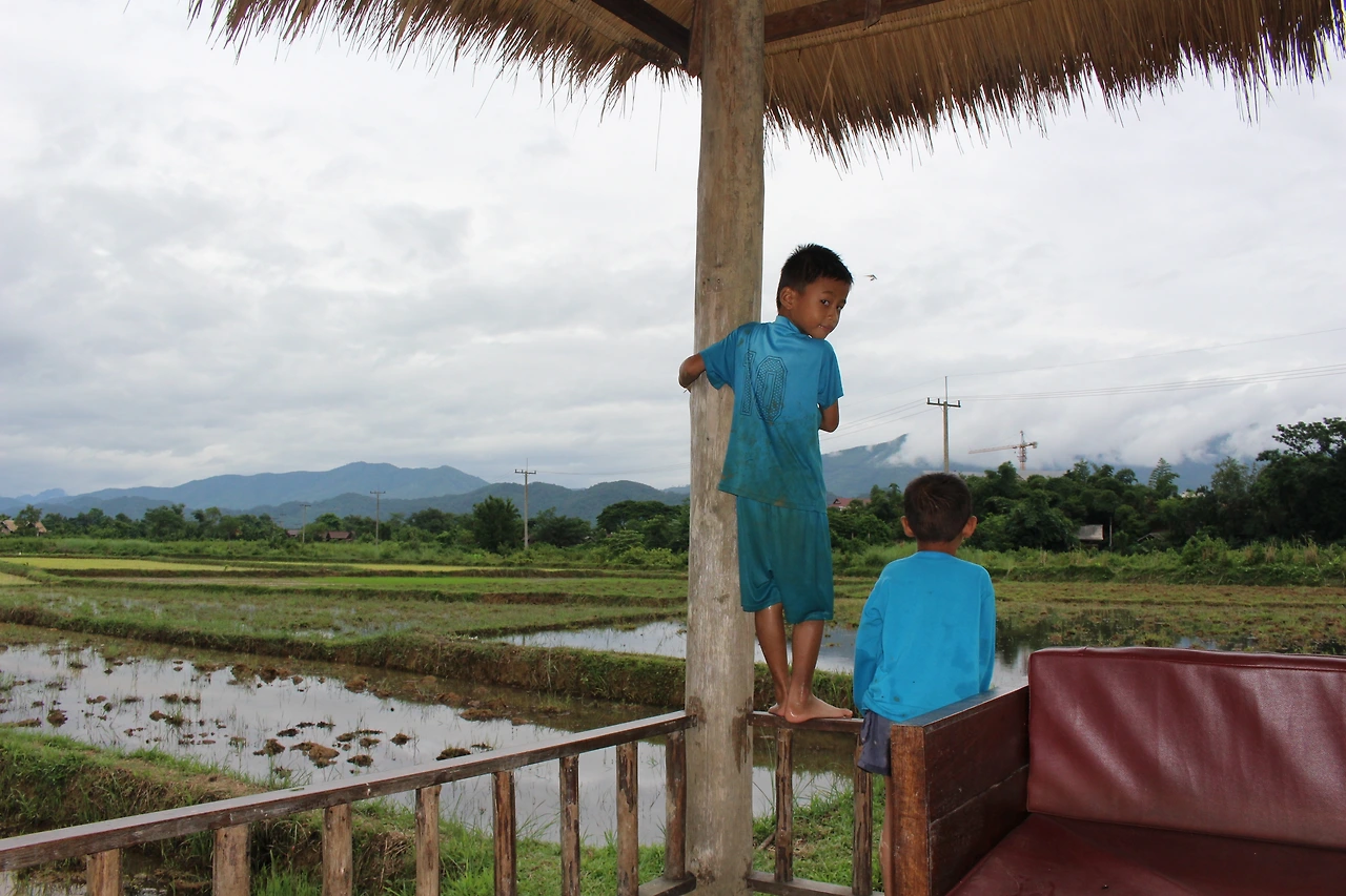 방은 그리 크지 않지만 넉넉하고 샤워기 물은 졸졸 나오지만 괜찮다. 문틈 사이로는 조그마한 도마뱀이 들락날락 거리지만 어쩔 수 없다. 여긴 라오스인걸? 이렇게까지 관대해질 수 있는 건 방에서 보이는 바깥 모습 때문일 거다. 한쪽이 모두 유리로 되어있는 방 안 침대에 누워 푸르름을 한없이 감상할 수 있다. 바다도 계곡도 산도 아닌 논이 이렇게 아름다웠던가.
