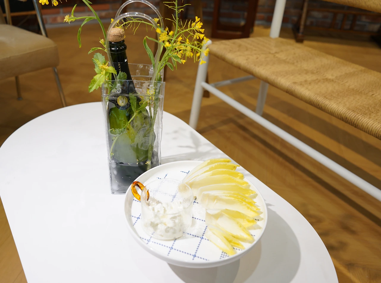 굳이 음식을 곁들일 필요는 없었지만, 크림치즈에 엔다이브를 콕 찍어 먹으며 홀짝홀짝 마셨다. 산미가 높아 잠들어있던 미각을 일깨워주니 식전주로도 좋을 듯하다. 라벨이 떼어진 허전함은 샛노란 유채꽃으로 채워보았다.