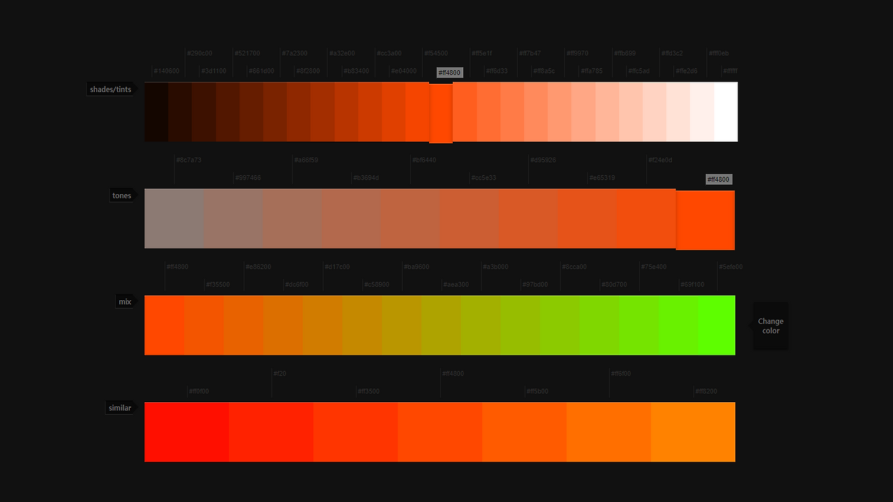 기준이 되는 컬러를 정하면 shades/tints, tone, mix, similar 네가지 형태의 자연스러운 컬러 변화를 확인할 수 있습니다. 자연스러운 컬러의 흐름이나 변화가 필요할 때 유용한 서비스입니다.