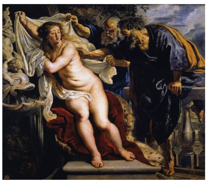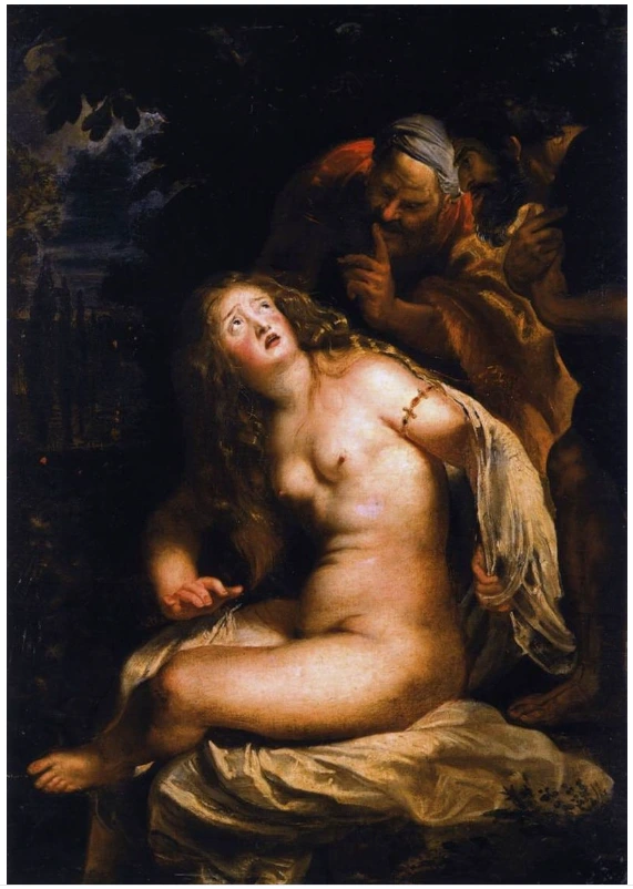 틴토레토가 그린 수산나는 오히려 관객을 정면으로 응시하며 유혹하는 듯한 자세를 취하고 있고, 루벤스의 수산나는 겁먹은 듯한 모습으로 그려져있다. 희생자인 수산나의 고통은 고려되지 않은 채 두 노인을 유혹하는 여자, 때로는 두려움에 떠는 연약한 모습으로 재현되었던 것이다.