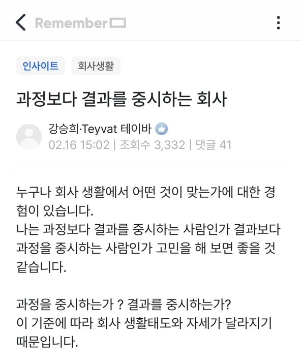 리멤버 커뮤니티 원본 글 보기 > 과정보다 결과를 중시하는 회사