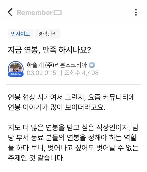리멤버 커뮤니티 원본 글 보기 > 지금 연봉, 만족 하시나요?