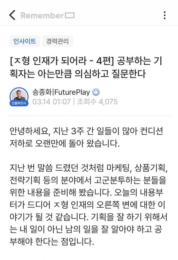 리멤버 커뮤니티 원본 글 보기 > [ㅈ형 인재가 되어라 - 4편] 공부하는 기획자는 아는만큼 의심하고 질문한다