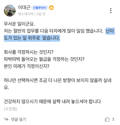 결국 리더에게 남는 건 한숨이며 그게 길어지면 번아웃입니다. 과감히 우선순위에 들지 못하는 일들을 내려놓으세요. 아무리 어려운 태스크라도, 해당 팀원이 미덥지 않더라도 그게 ‘리더가 꼭 해야 할 일’이 아니라면 그 팀원에게 일임하세요. 계속 해결사를 자처했다간 해결할 일이 많아지는 순간이 오면 당연히 번아웃이 생깁니다. 리더는 리더지 해결사가 아닙니다.
