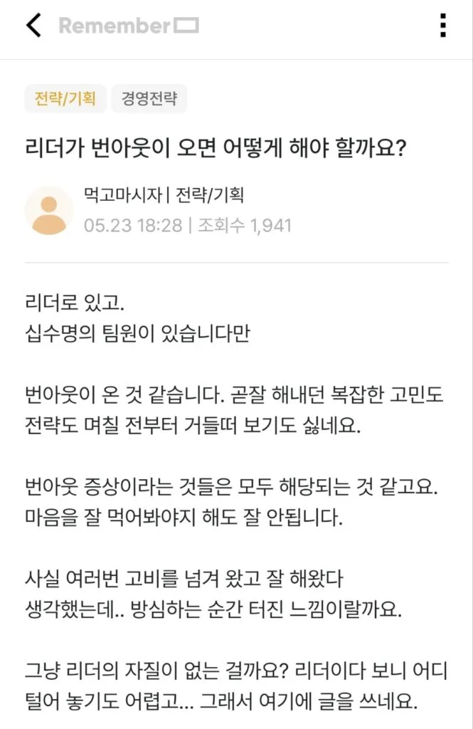 리멤버 커뮤니티 원본 글 보기 > 리더가 번아웃이 오면 어떻게 해야 할까요?
