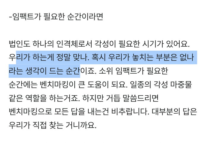 그래서 벤치마킹은 쓸모없고, 멀리해야 하는 걸까요? 그렇지 않습니다. 모든 비즈니스는 ‘각성'의 순간이 필요합니다. 지지부진한 사업 속에서 돌파구를 찾아야 할 때, 오랫동안 해오던 관성에 의해서만 일하고 있을 때, 위기를 느낄 때 “아, 이러고 있으면 안 되는구나”, “아, 저기는 저렇게 하고 있는데 우리는 뒤처지는 게 아닐까"라는 생각을 할 수 있어야 합니다. 벤치마킹은 팀에 경종을 울리는 역할을 합니다. 새로운 방향으로 시선을 돌릴 수 있는 임팩트를 가져다주죠. 비즈니스의 전환은 정신이 내부에만 쏠려있어서는 이뤄내기 어렵습니다.