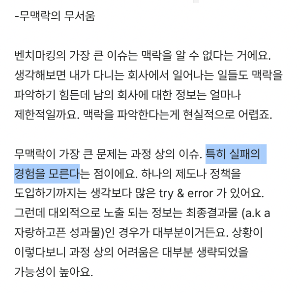 세상 모든 일에는 맥락이 있습니다. 하물며 복잡하기 그지없는 비즈니스에서는 더하겠죠. 단순해 보이더라도 어떤 일이 일어나고 효과를 내기까지는 수많은 실패와 시행착오가 (거의 무조건) 있습니다. 그런데 많은 사람들이 벤치마킹을 할 때 최종 결과물만 봅니다. 사실 최종 결과물밖에 볼 수 없는 경우가 대다수죠. 어떤 회사가 자기들이 한 일을 외부에 알릴 때는 자랑하고 싶은 성과만 내세우니까요. 그러니 막상 따라 하려고 하면 생각대로 잘 안 되는 겁니다. 벤치마킹 대상 회사의 시행착오를 그대로 답습하게 되고요.