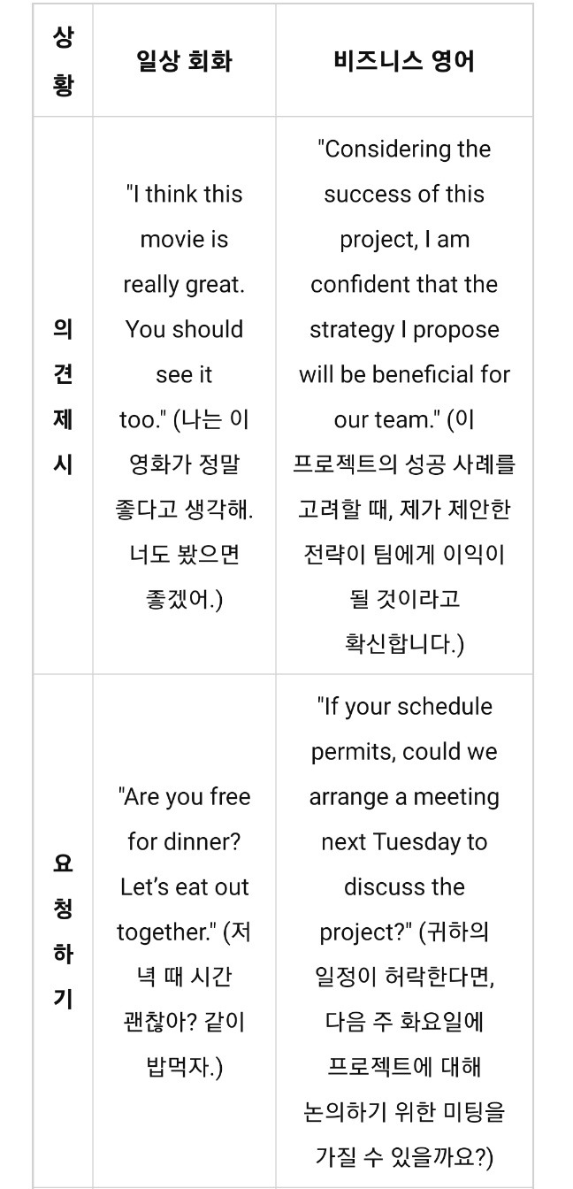 각 상황에서 언어가 어떻게 사용되는지를 명확하게 비교하기 위해 일상 회화와 비즈니스 영어의 차이점을 예시 문장과 함께 표로 정리해 보았다.