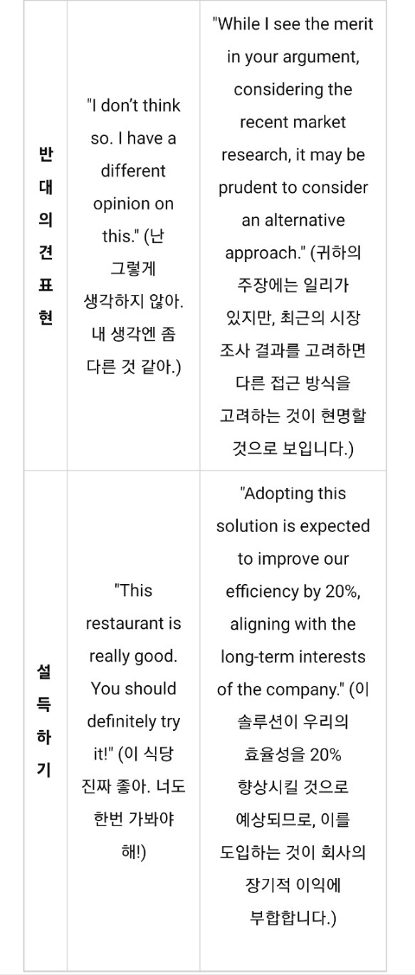 이 표는 일상 회화와 비즈니스 영어 사이의 주요 차이점을 네 가지 상황(의견 제시, 요청하기, 반대 의견 표현, 설득하기)으로 나누었다.