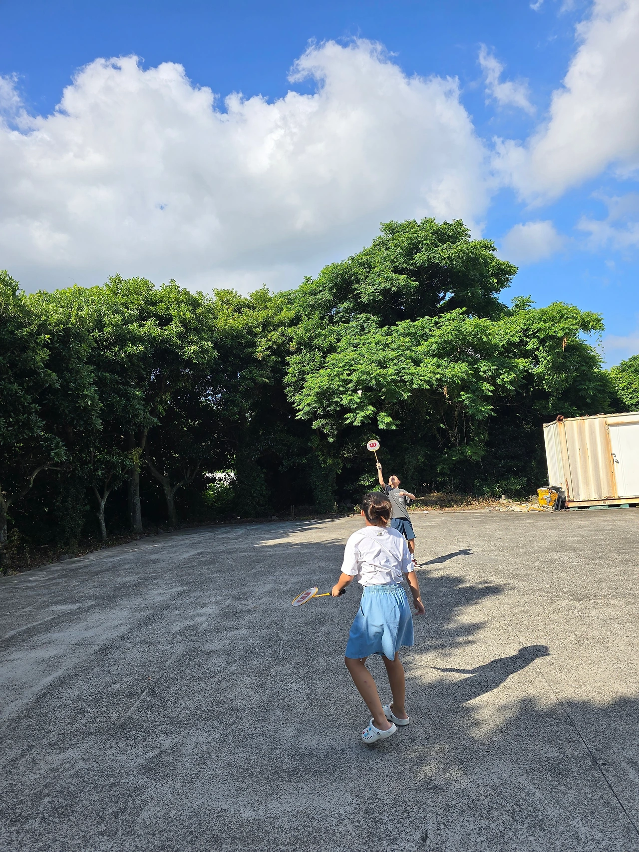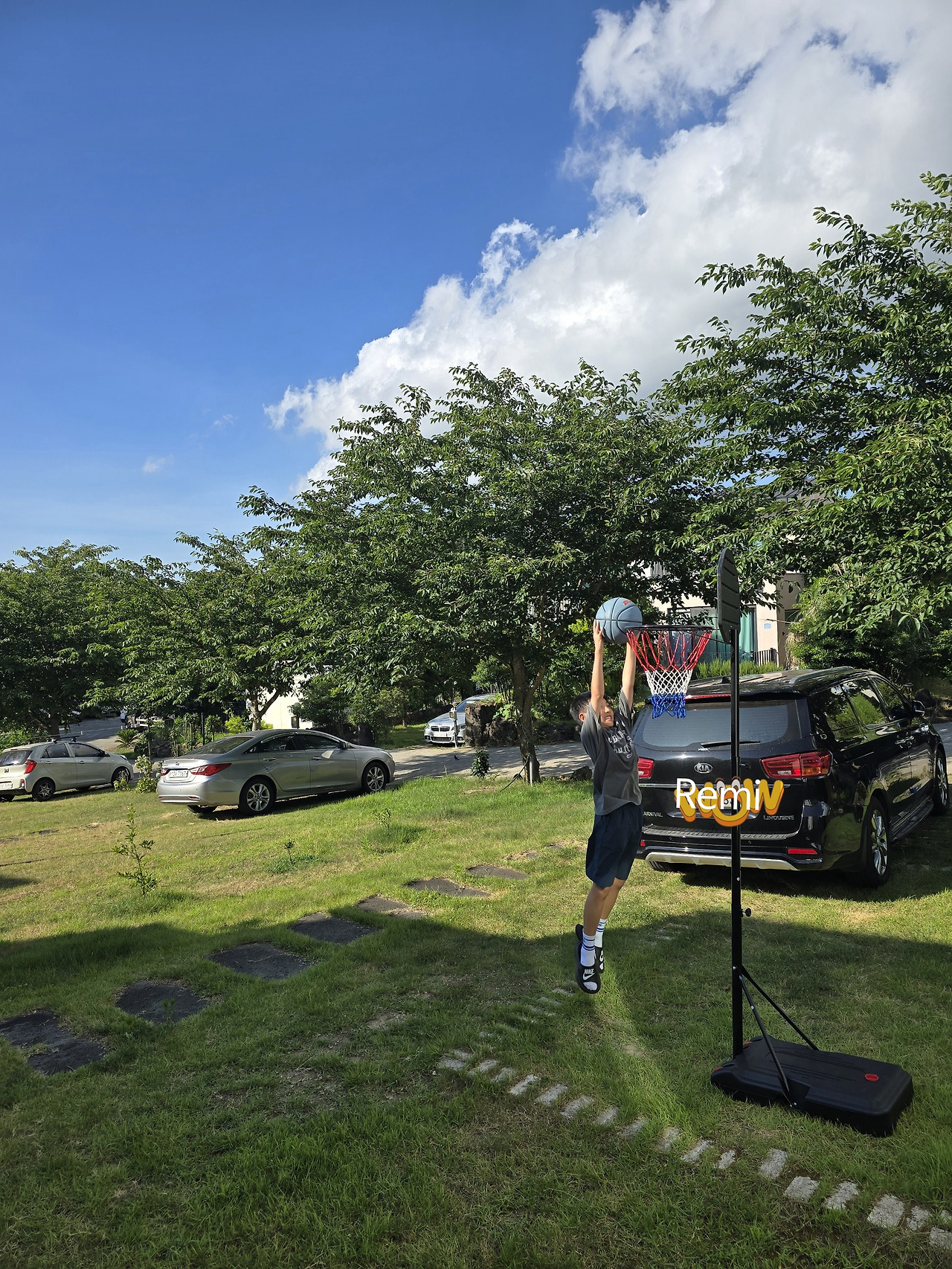 마당에서 농구공을 튕기고 배드민턴 라켓을