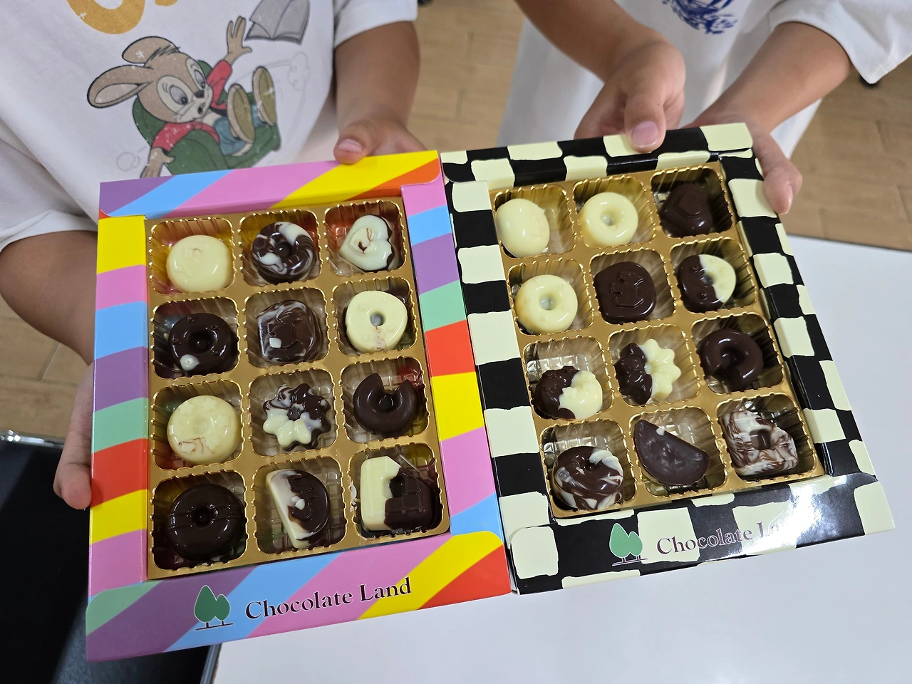 아이들은 이곳에서 두 가지 색의 초콜릿을 짜
