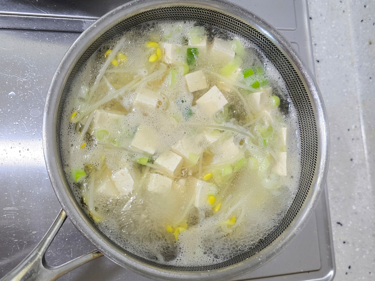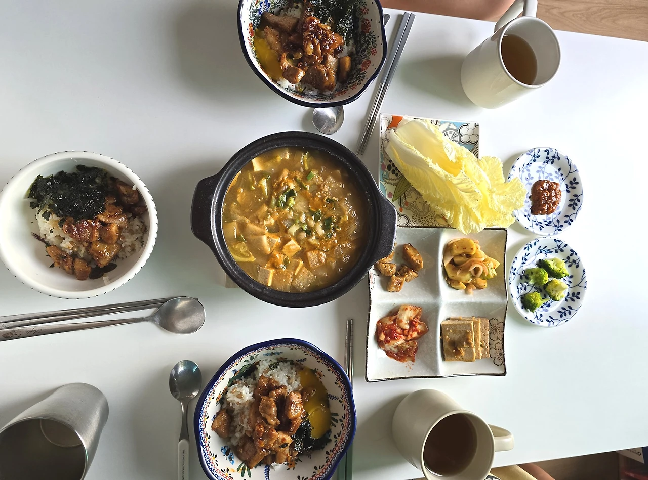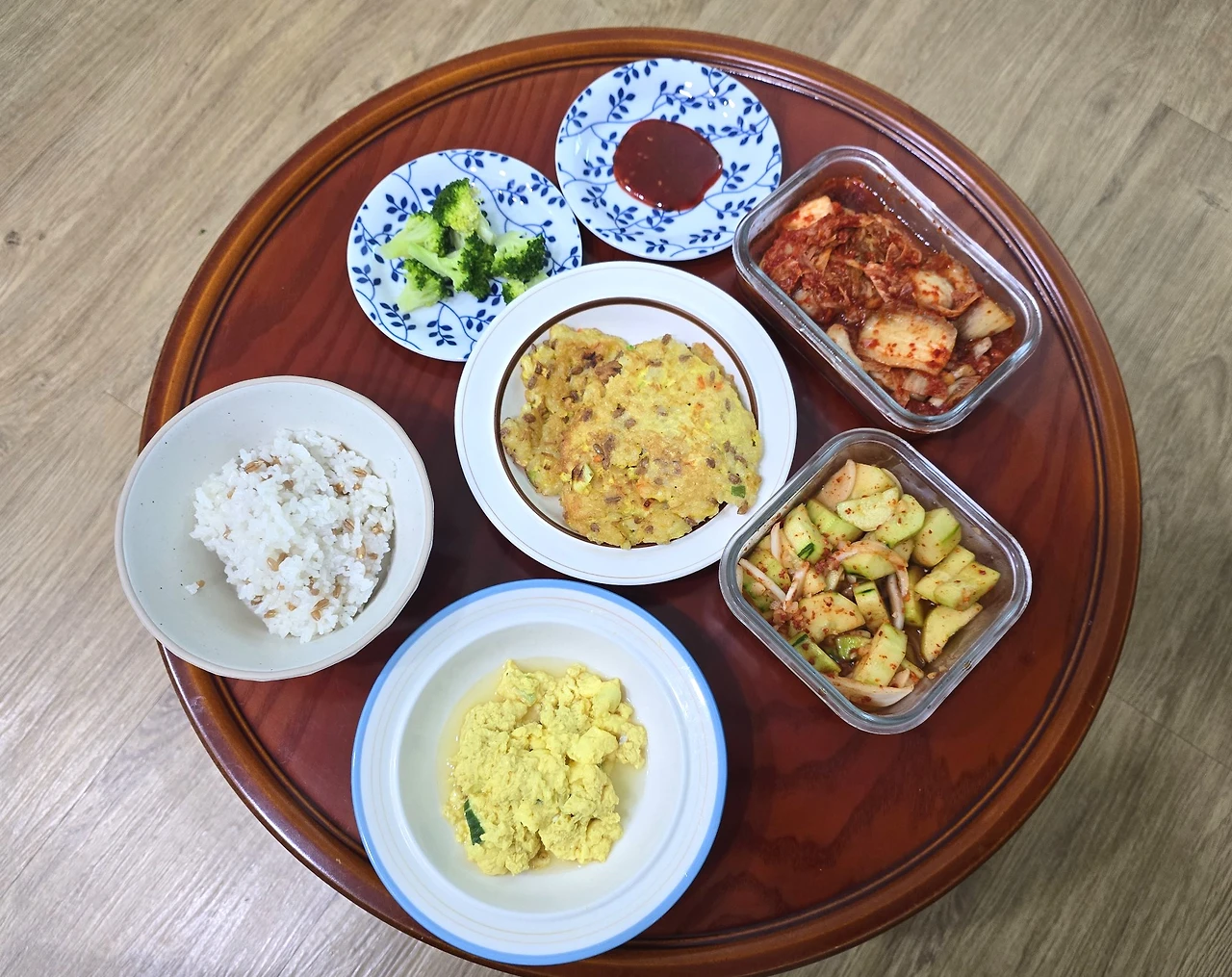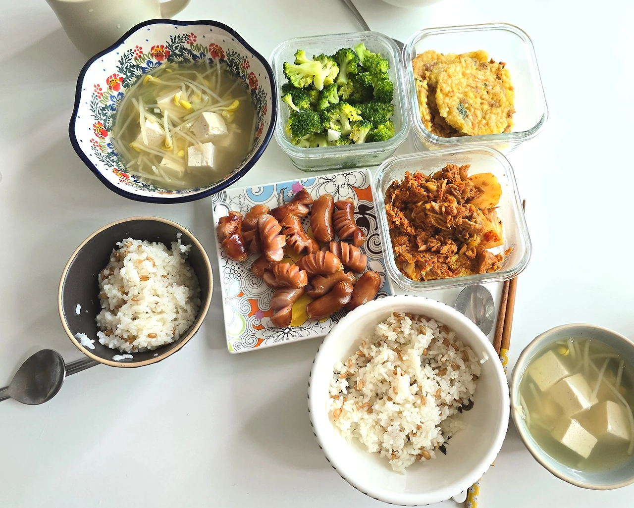 된장찌개, 고기양념 덮밥, 배추쌈, 브로콜리, 두부부침, 김치, 그리고 따뜻한 보리차까지 매일 주방 가스레인지는 즐겁게, 역동적으로 가동한다.
