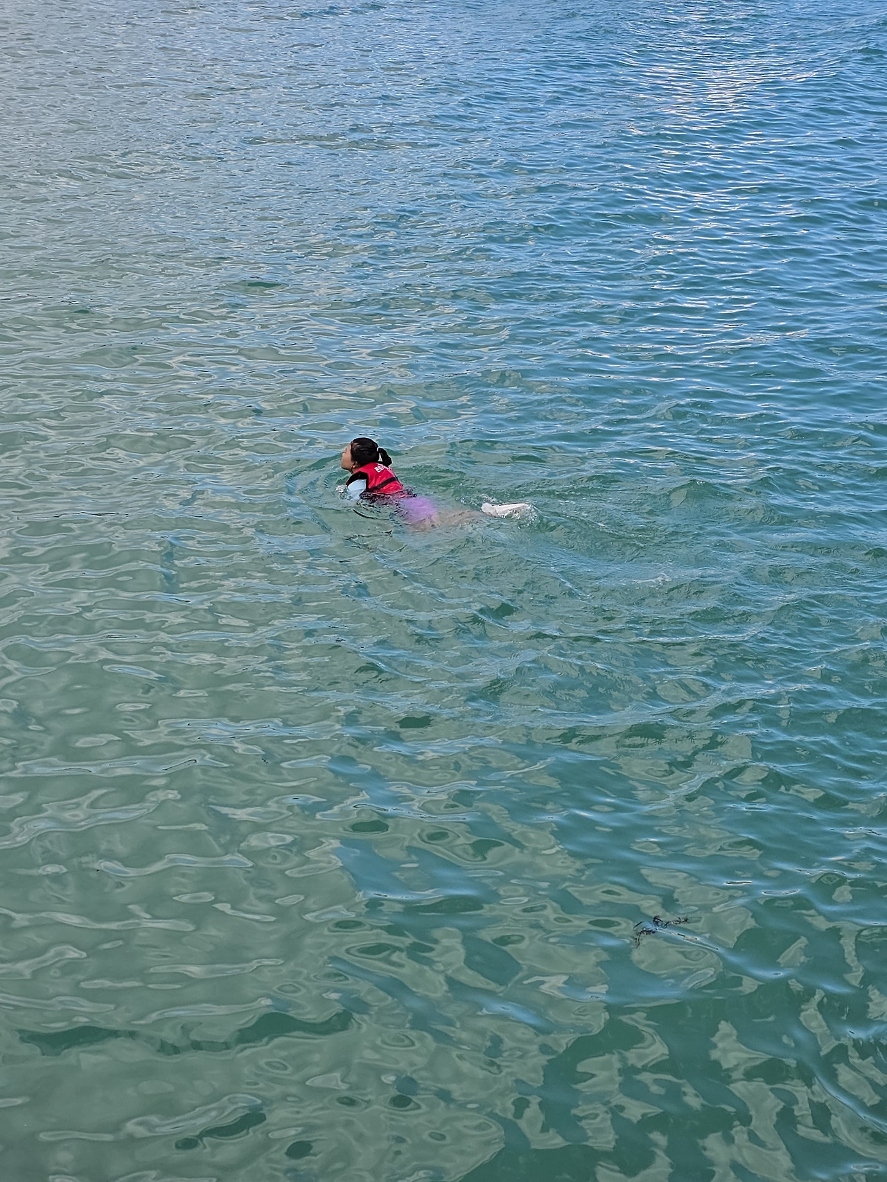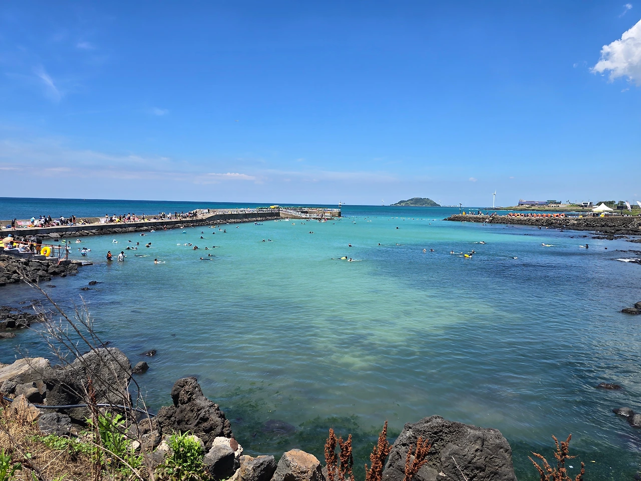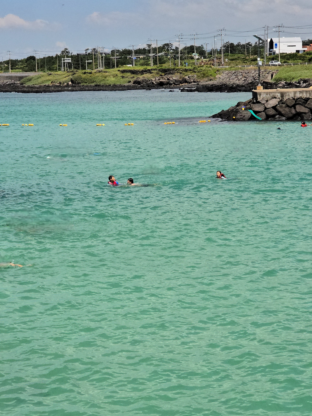 현무암 바위와 콘크리트 바닥 위로 펼쳐진 평화로운 바다였다. 모래 걱정 없이 아이들이 마음껏 수영을 즐길 수 있는 드문 장소. 입수는 계단으로 안전하게 할 수 있었고, 생각보다 수심이 깊지 않아 튜브 하나면 두 시간은 순삭.
