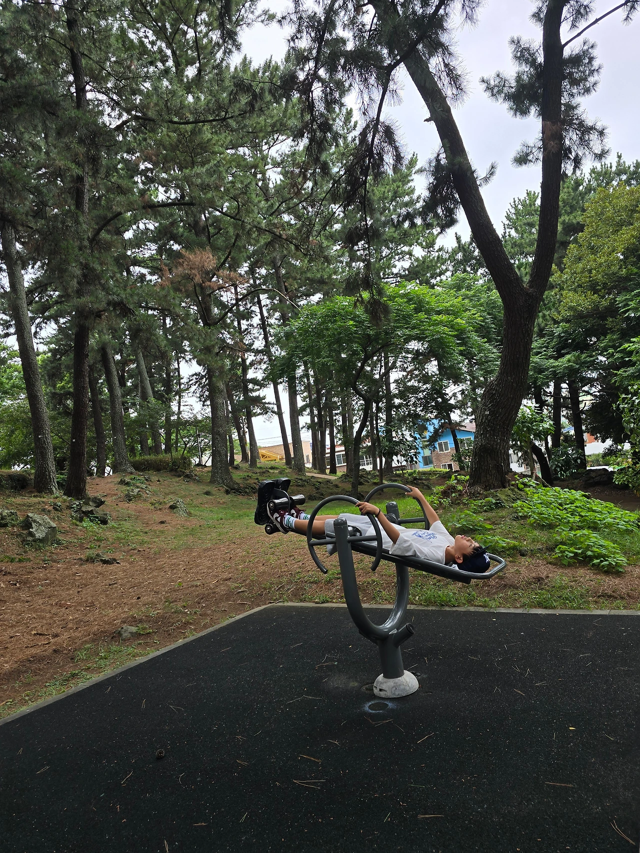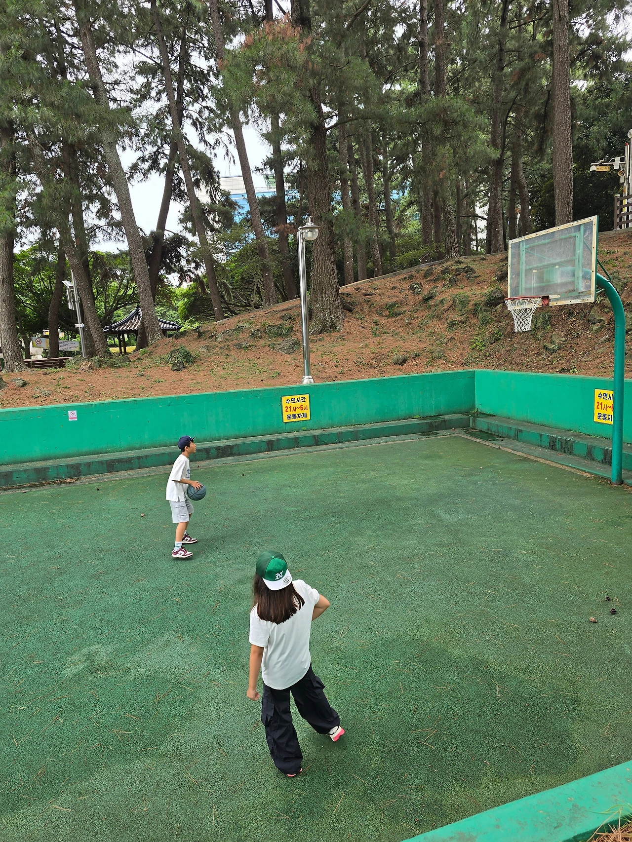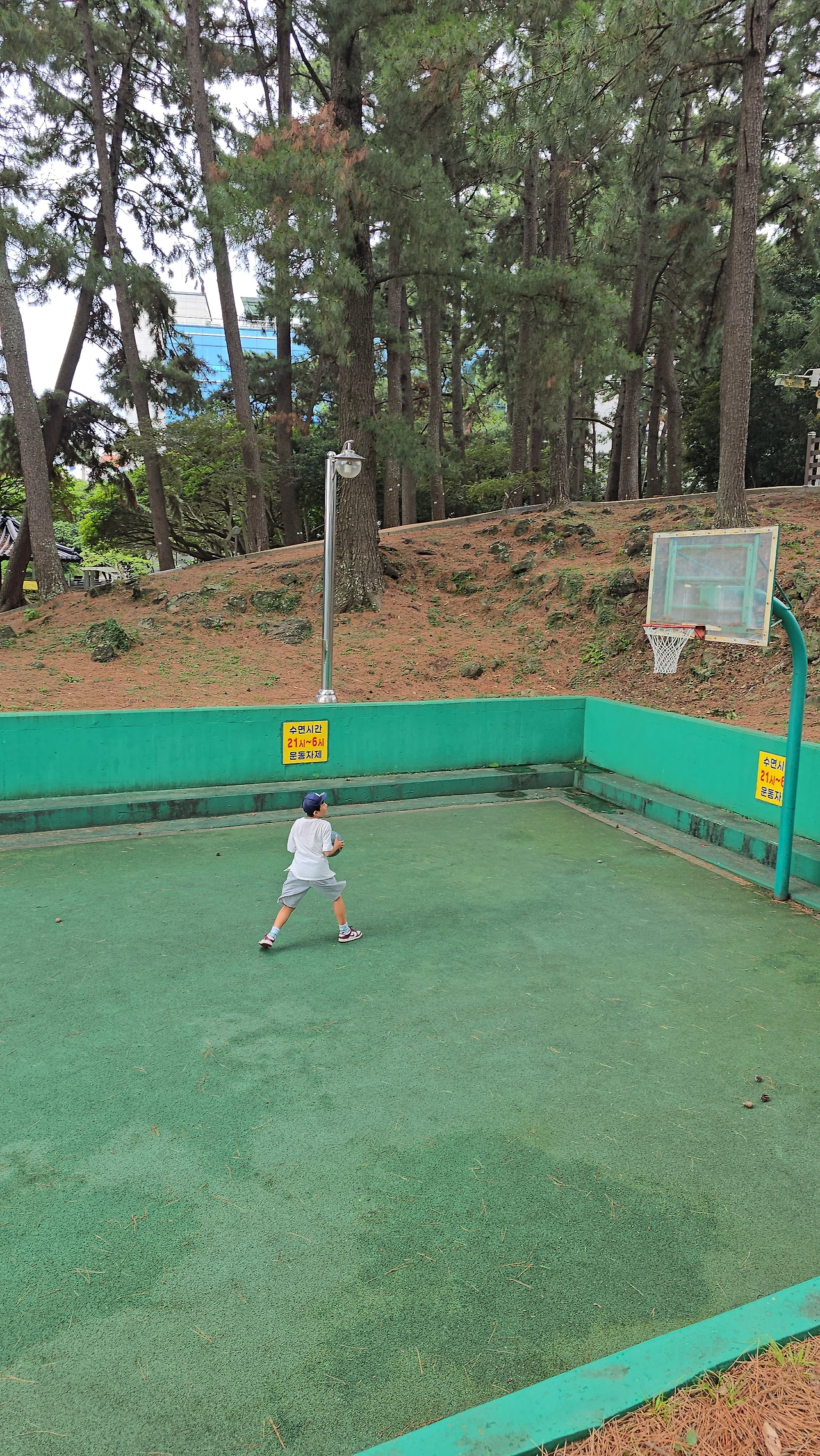 비는 그치고 하늘은 다시 맑았지만 땅에는 여전히 빗물과 습기가 남아 있었다. 피톤치드를 마시며 운동기구에서 몸을 풀고 농구 코트에서 함께 농구를 즐기니 제주 날씨처럼 늘 변화하는 일상 속에서 소소한 행복을 찾을 수 있었다.