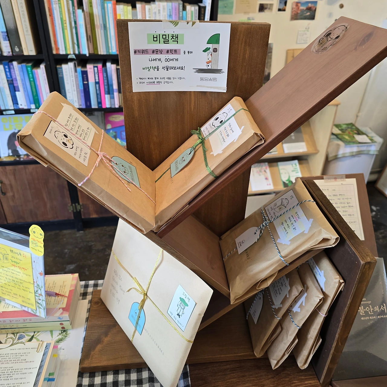 책방 한쪽에는 비밀책이라는 코너가 있었다. 갈색 포장지에 싸인 채 표지도 제목도 없는 책들. 오직 짧은 손글씨와 몇 개의 키워드만이 선택의 단서였다. 직접 내용을 들여다볼 수 없으니 온전히 감각과 직관으로만 고를 수밖에 없다.