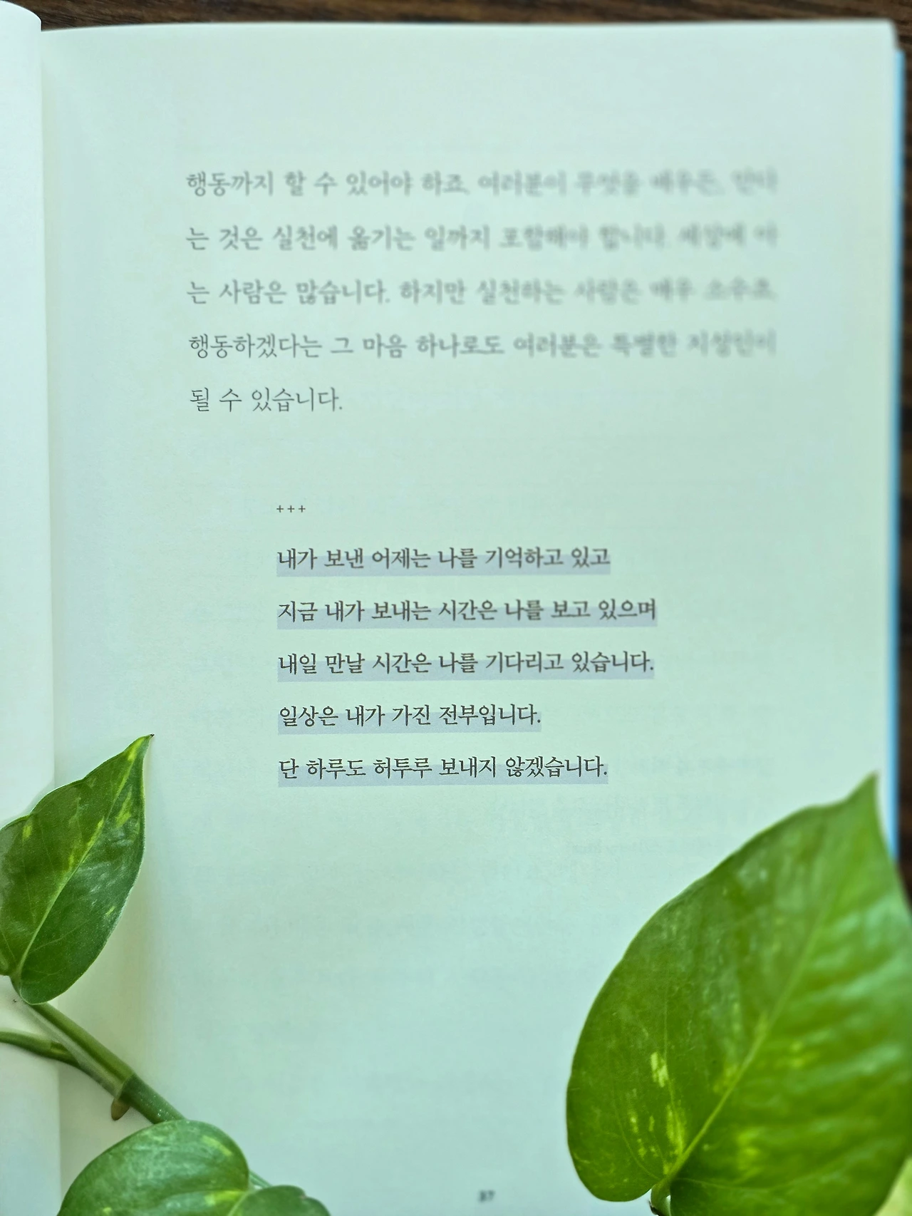 엄마라는 이름으로 살다 보면 나를 잃어버리는 순간이 많았다. 아이들을 위해서라며 내 꿈을 미뤘지만 책은 단호히 말한다. 아이들에게 가장 큰 선물은 스스로의 삶을 흔들림 없이 살아내는 부모라고. 내가 나의 삶을 지켜낼 때 아이들 역시 자신의 길을 믿고 걸어갈 수 있을 것이다.