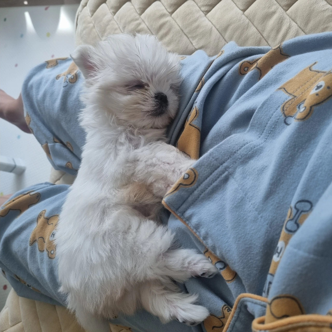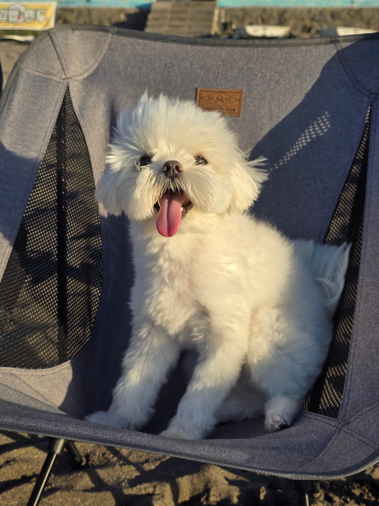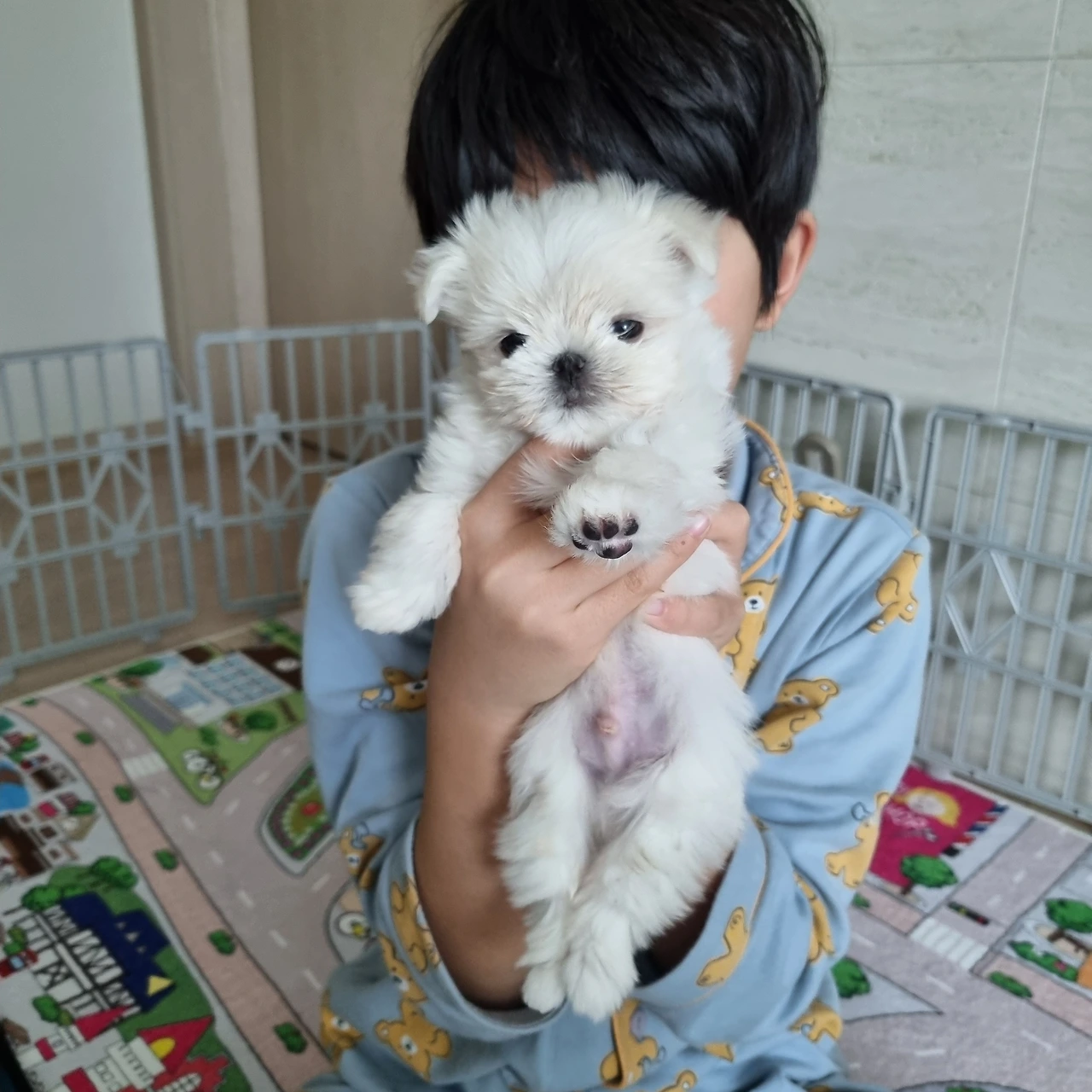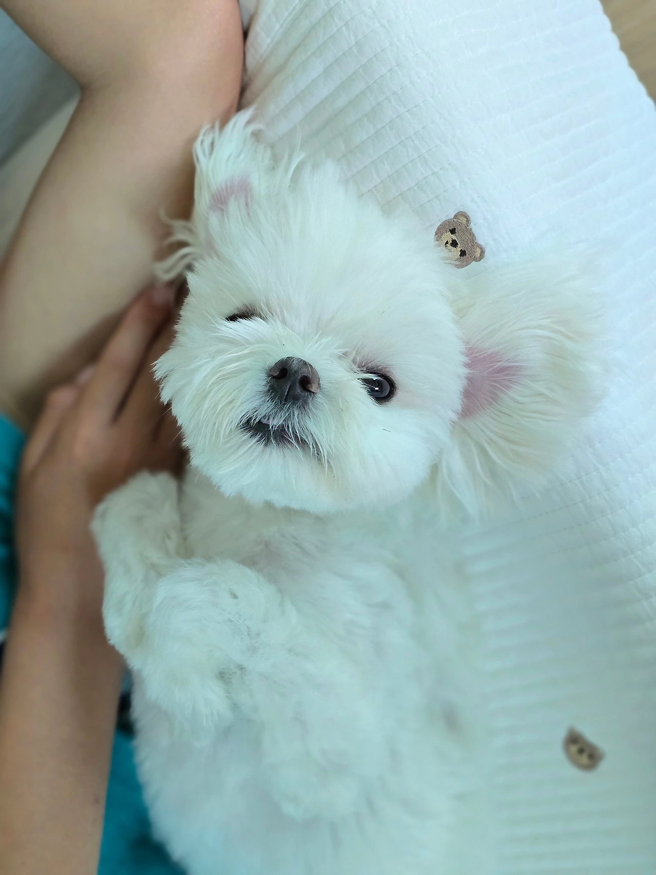 2년 전 어느 날, 육지에서 아이들과 시내로 가는 날, 반짝이는 유리문 너머에서 눈송이처럼 작은 말티즈