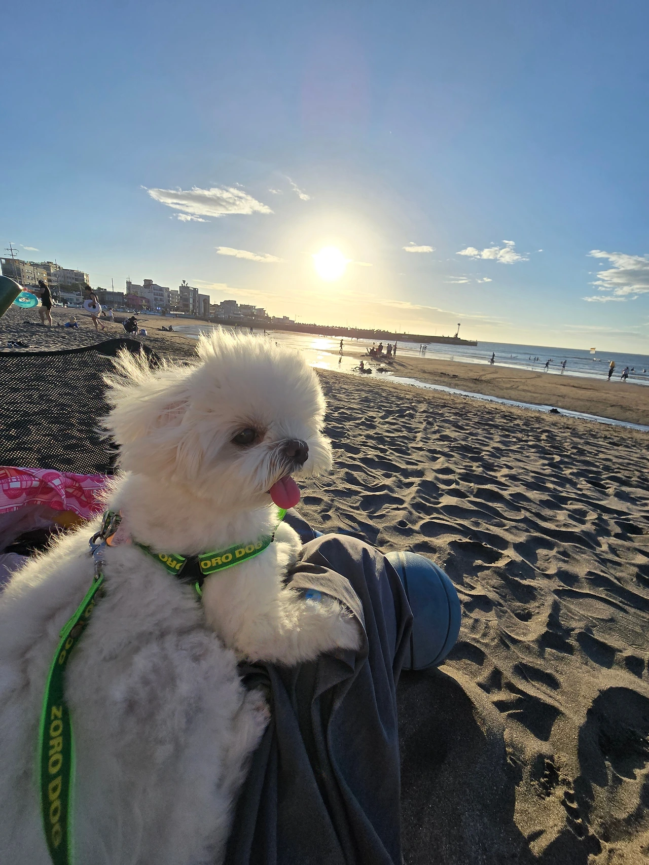 해 질 무렵, 주황빛 하늘 아래 코코는