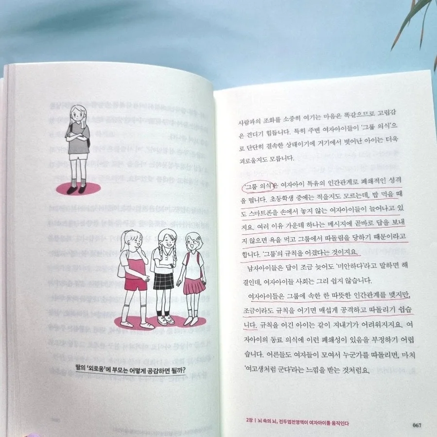 '남자아이들은 답이 조금 늦어도 미안하다고 말하면 해결인데 여자아이들 사회는 그룹에 속한 한 따뜻한 인간관계를 맺지만 조금이라도 규칙을 어기면 매섭게 공격하고 따돌리기 쉽습니다. 유대감을 중시하기에 약간의 이질적인 언동을 보이면 민감하게 반응하는 것은 여자아이 특유의 행동입니다.'
