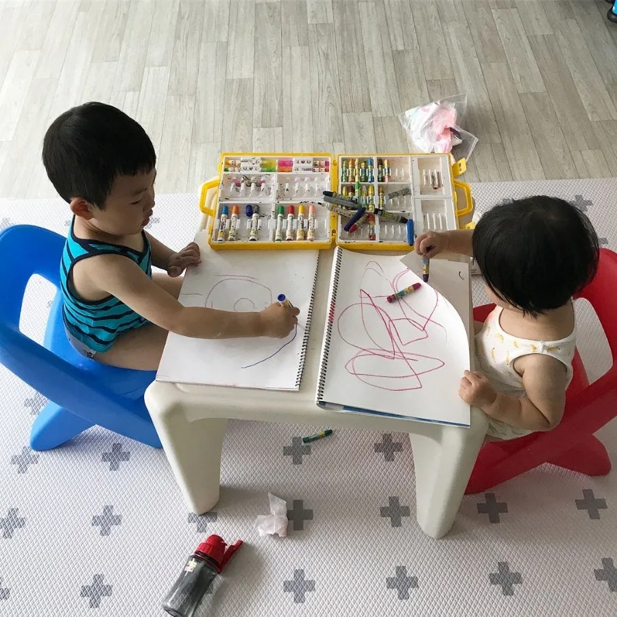 연발하는 남매. 엄마는 물감과 크레스파스,