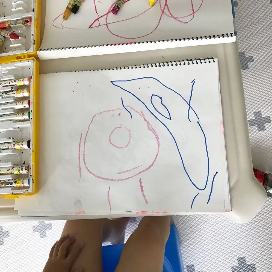 색연필을 제공하고 옆에서 "오구오구, 우쭈쭈,