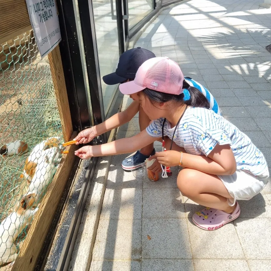 아이들이 매표소에서 먹이(당근, 양배추)를