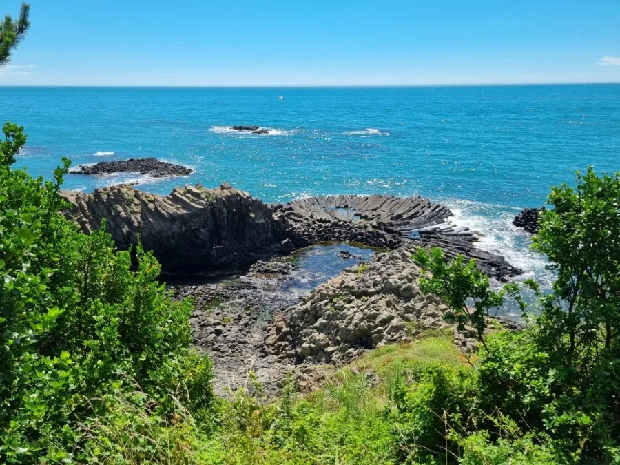 읍천항의 고요한 바다와 주상절리의 장엄한 풍경.