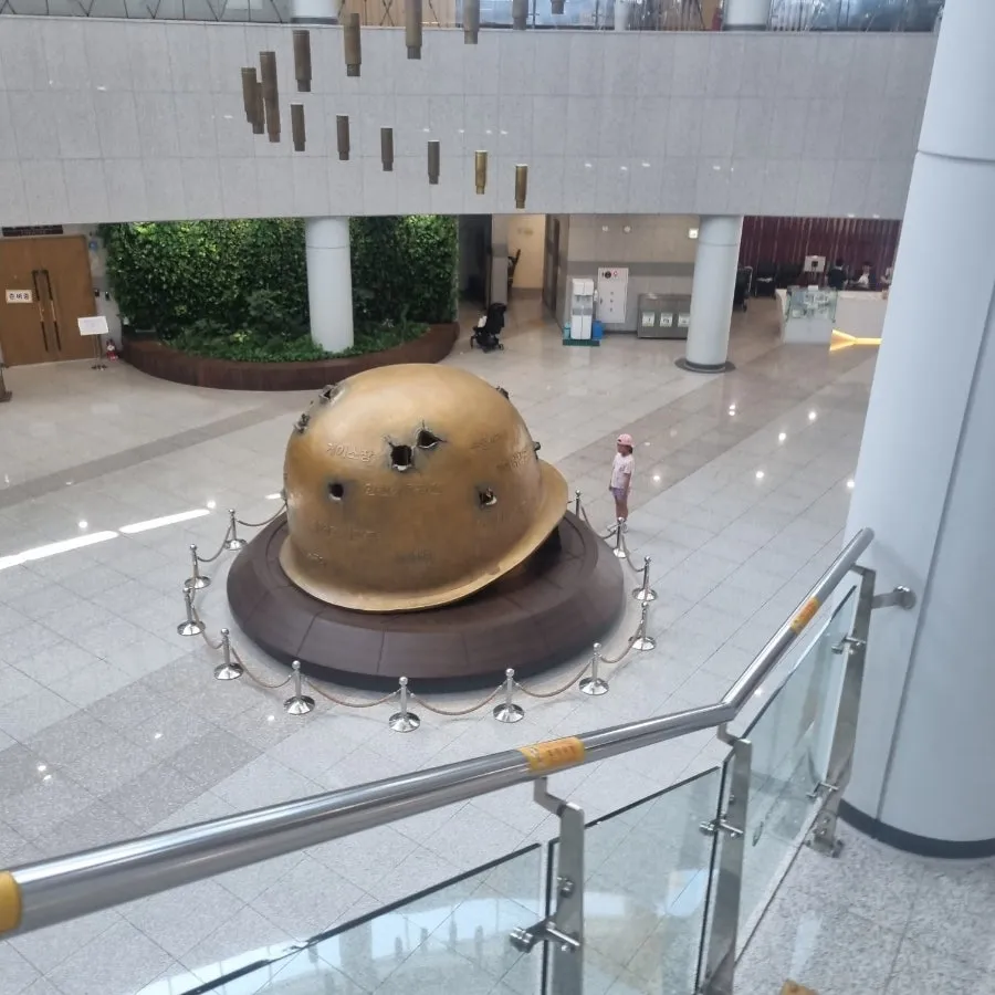 로비 중앙에 전시된 구멍 난 철모 앞에서