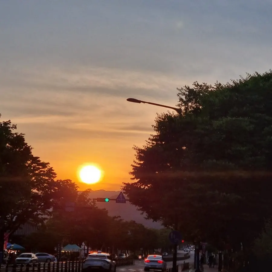 해 질 무렵, 나무 사이로 붉게 타오르던 노을은