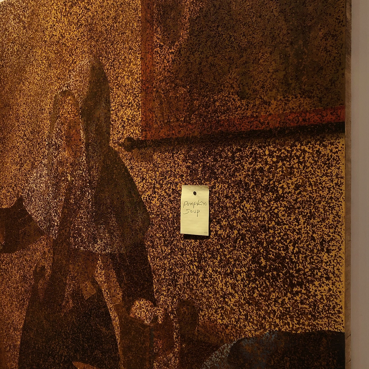 요하네스 베르메르의 '물주전자를 든 젊은 여인', '우유 따르는 여인'을 재해석 한 작품이다. 펌킨 쥬스라 적혀 있는 포스트잇을 보고 커피를 이어 호박죽을 뿌린 건가 싶었는데 세월의 흔적을 표현하기 위해 철가루를 뿌리고 부식시켰다고 한다.