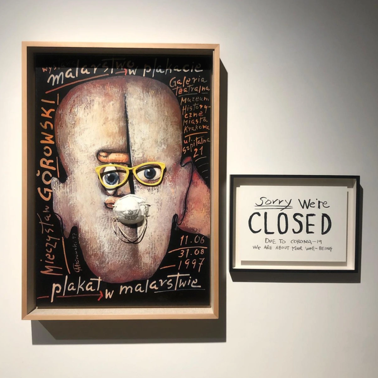 위의 작품은 목탄, 에나멜 도료를 사용할 때 마스크를 끼고 작업하기에 마스크를 포스터에 붙였던 것인데 코로나 19 시국과 연계된다는 점이 흥미로워 2003년에 만들어 놓았지만 다시 전시하게 되었다고 한다.