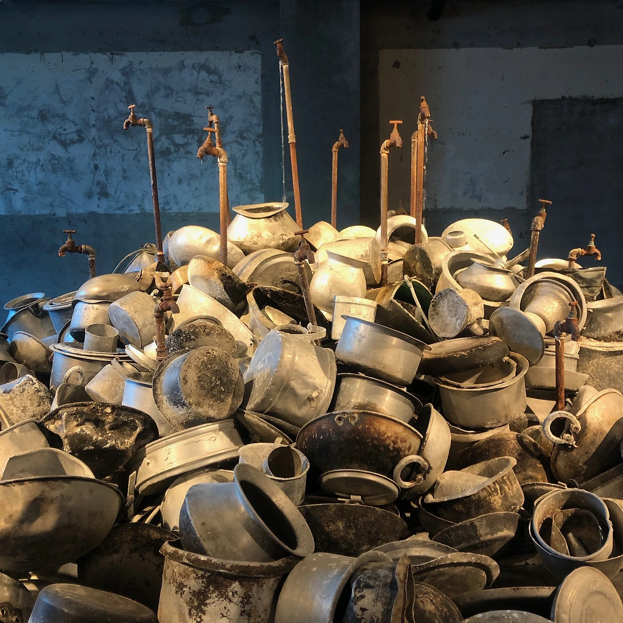 수보드 굽타 <배가 싣고 있는 것을 강은 알지 못한다, 2012, mixed media> <모퉁이를 돌다, found aluminum utensils, water piper, tap, cement, wire, pump and water variable dimensions>