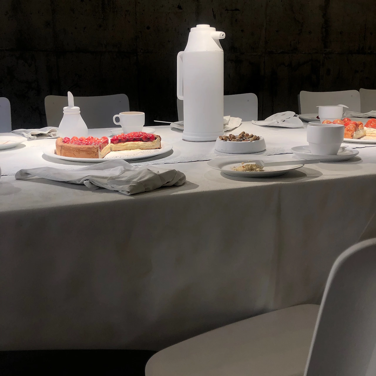 성인의 신장과 비슷한 높이로 테이블을 확대시켜 만든 작품으로, 관람자들은 약 7세 정도 아이의 시선으로 작품을 바라볼 수 있다고 한다. 흰색으로 가득한 시선에 음식과 담배가 심하게 반대된다. 담배밖에 안보였던 것 같기도 하고,