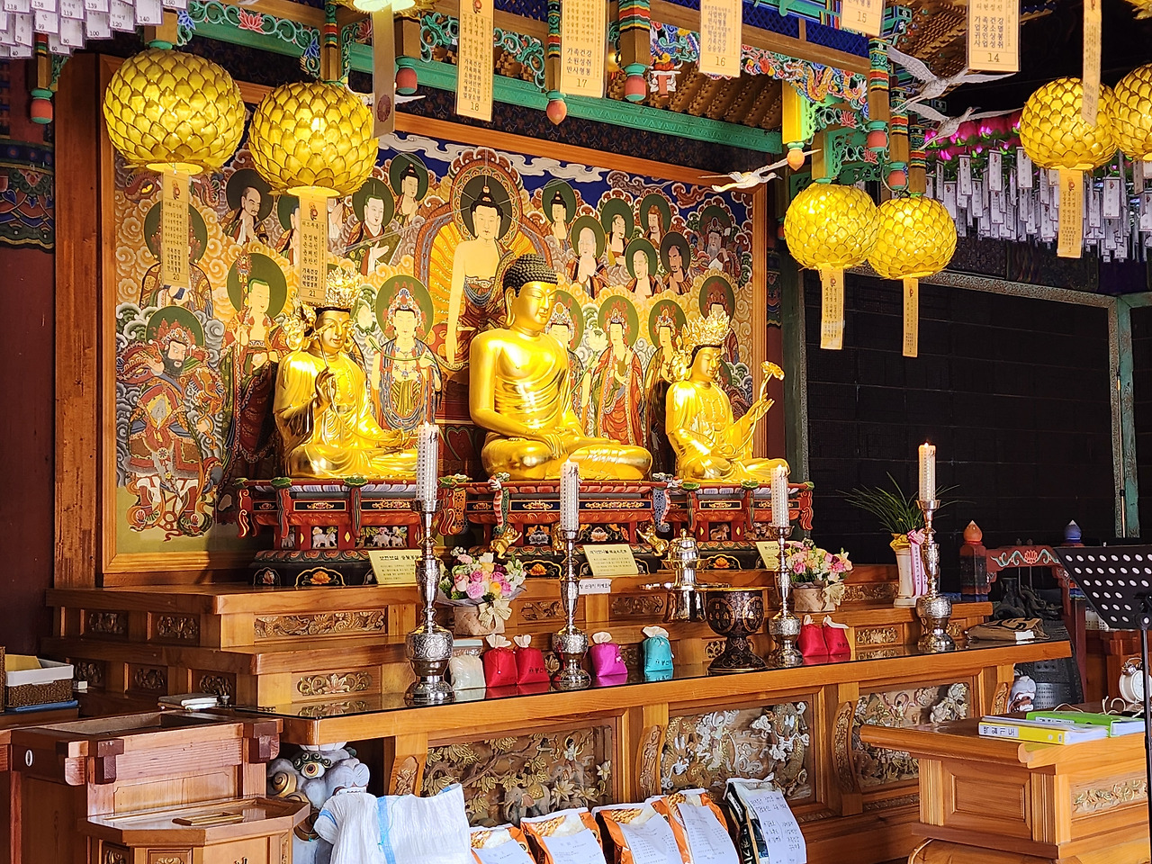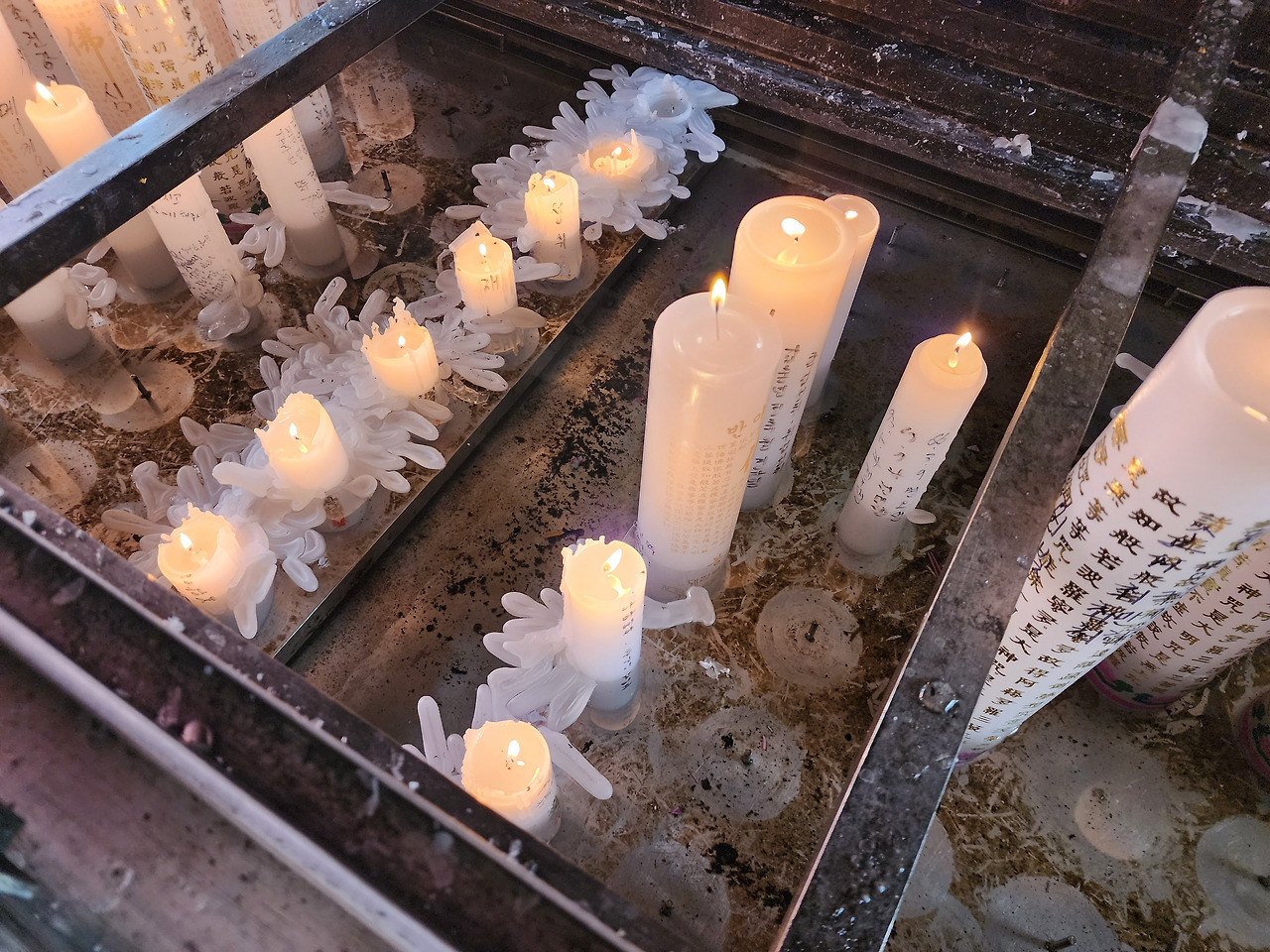 일주문을 지나 길을 따라 올라가자 청풍루가 보인다. 나는 희한하게도 청풍루를 봐야 봉선사에 왔다는 느낌이 든다. 가끔 연꽃축제 등을 하면 일주문을 지나서 연꽃밭에만 온종일 있다가 왔기 때문에 절에 왔다는 느낌을 못 받아서 그런지 청풍루까지는 올라가야 봉선사에 왔다는 느낌이 든다. 오랜만에 와서 어디에 초를 켤 수 있는지 몰라 보살님께 물었다. 직접 키고 싶으면 청풍루로 가고 아니면 법당에 올려두고 가라고 하신다. 그러면 나중에 법당에 켜주신다고 말이다. 나는 이왕 온 김에 내가 촛불을 켜고 싶어서 청풍루로 갔다. 청풍루 아래에는 양옆으로 사천왕을 모셔 놓고 가운데에 초를 공양할 수 있게 조성해 놓았다. 큰 초의 비닐을 벗기고 가족들 이름을 쓴 뒤 초를 켰다. 그리곤 계단을 오르자 큰 법당이 보인다.